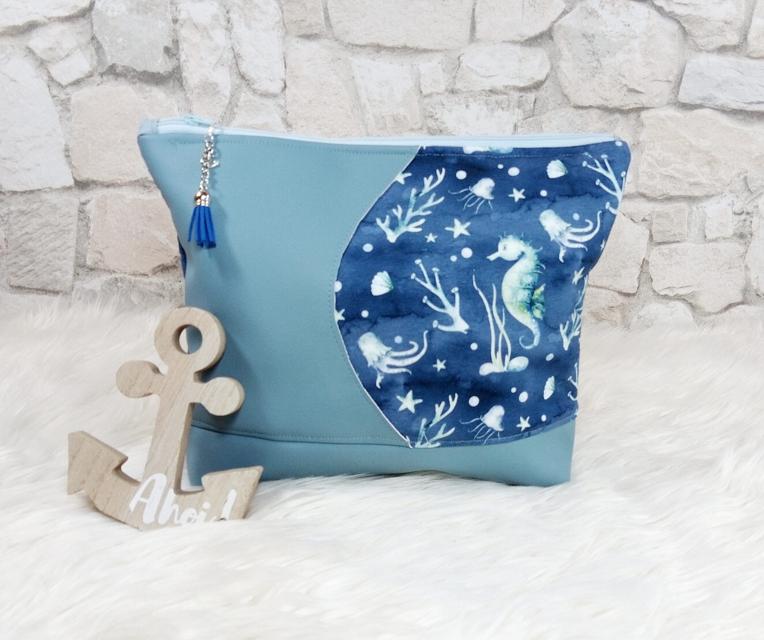 Die große Kulturtasche wurde außen aus Kunstleder und Baumwolle hergestellt.