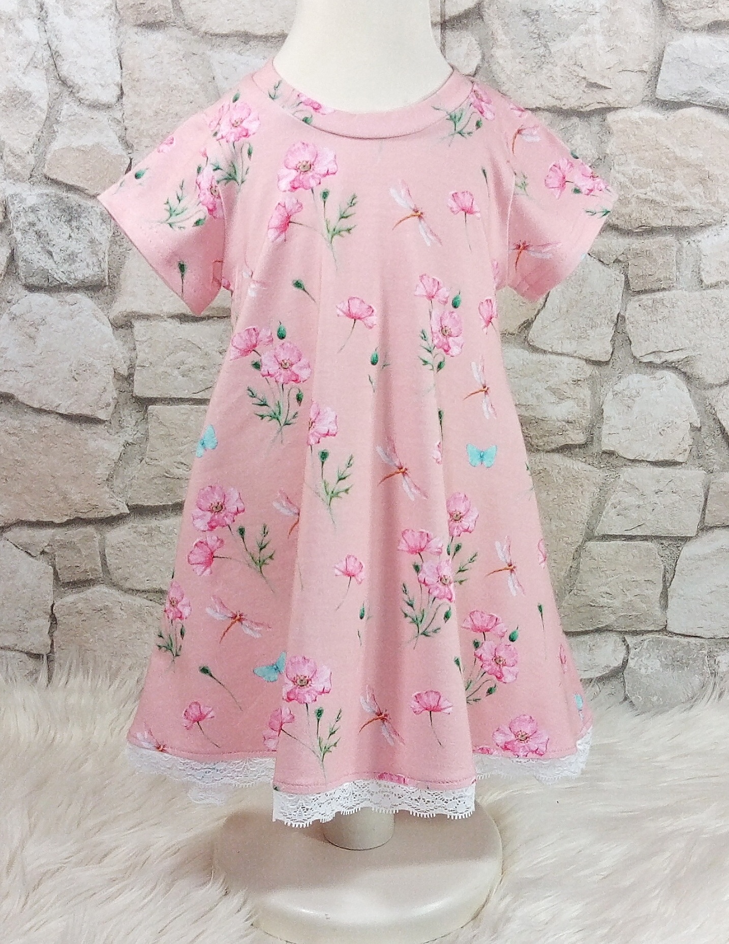 Süßes Mädchenkleid aus Baumwolljersey, dass mit einem Spitzenband gesäumt wurde.