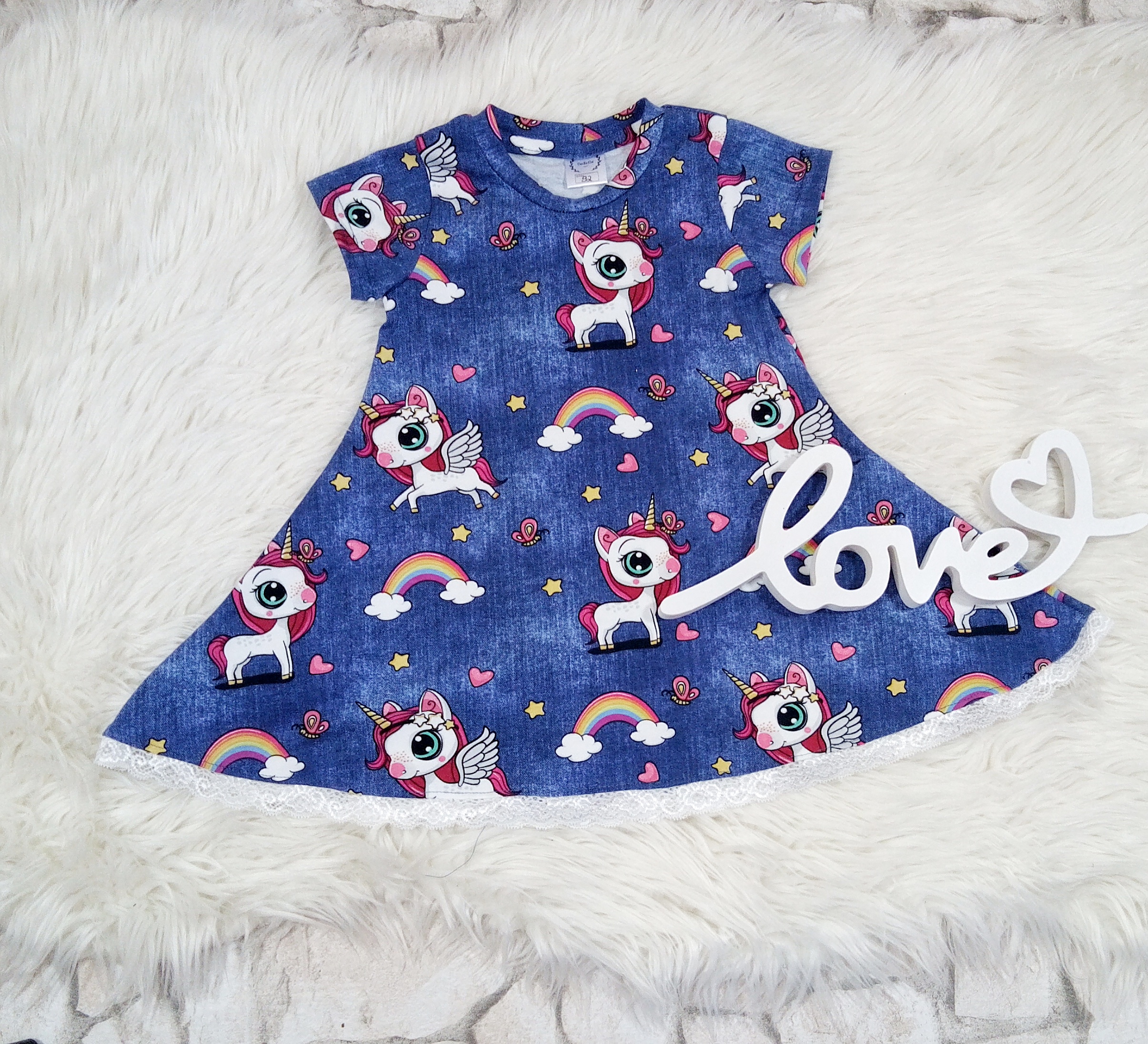 Süßes Mädchenkleid aus Baumwolljersey, dass mit einem Spitzenband gesäumt wurde.