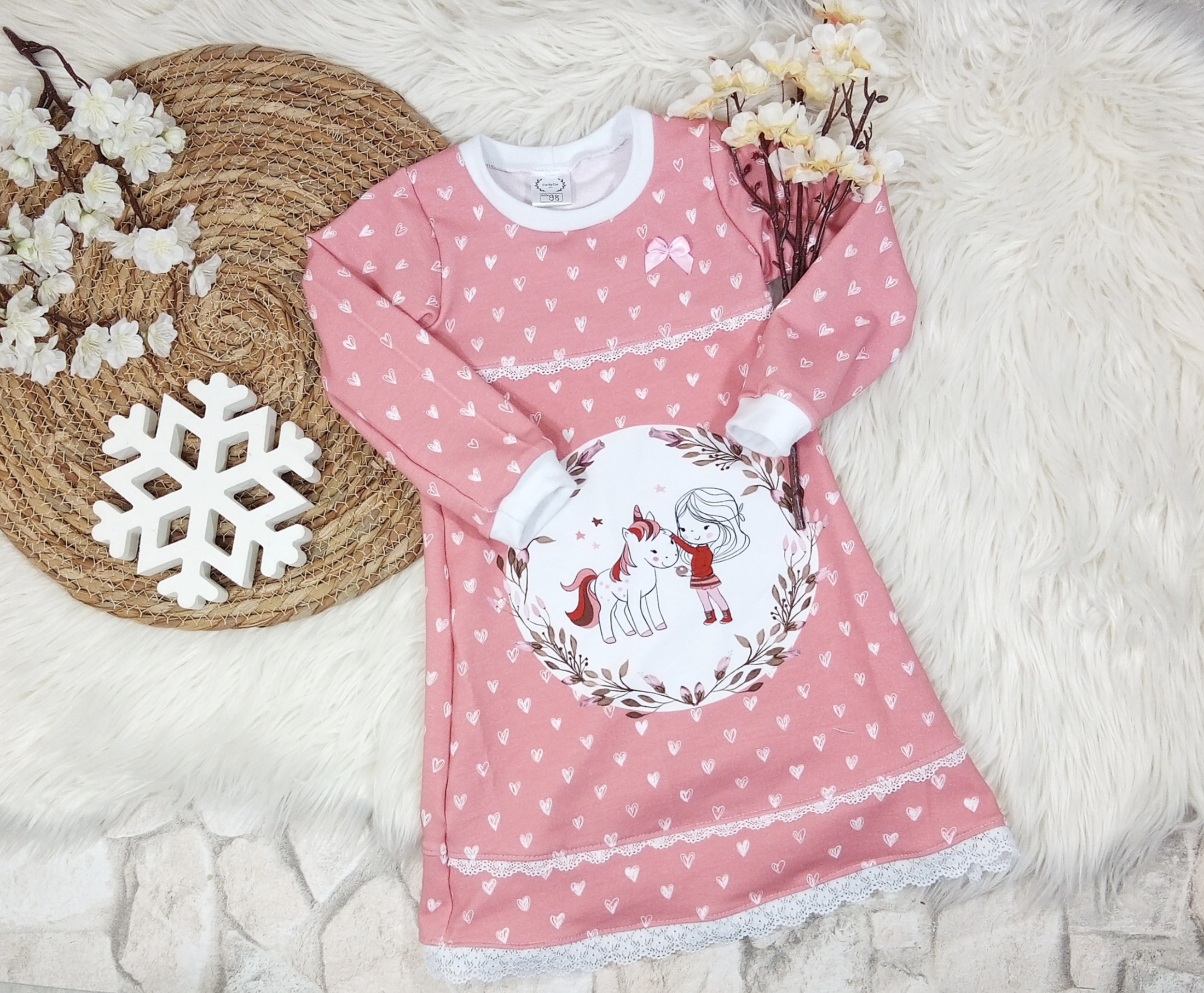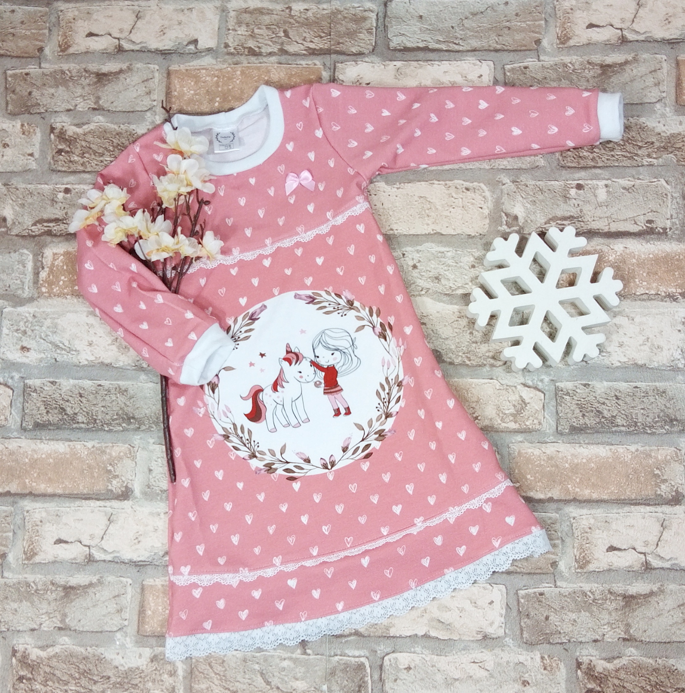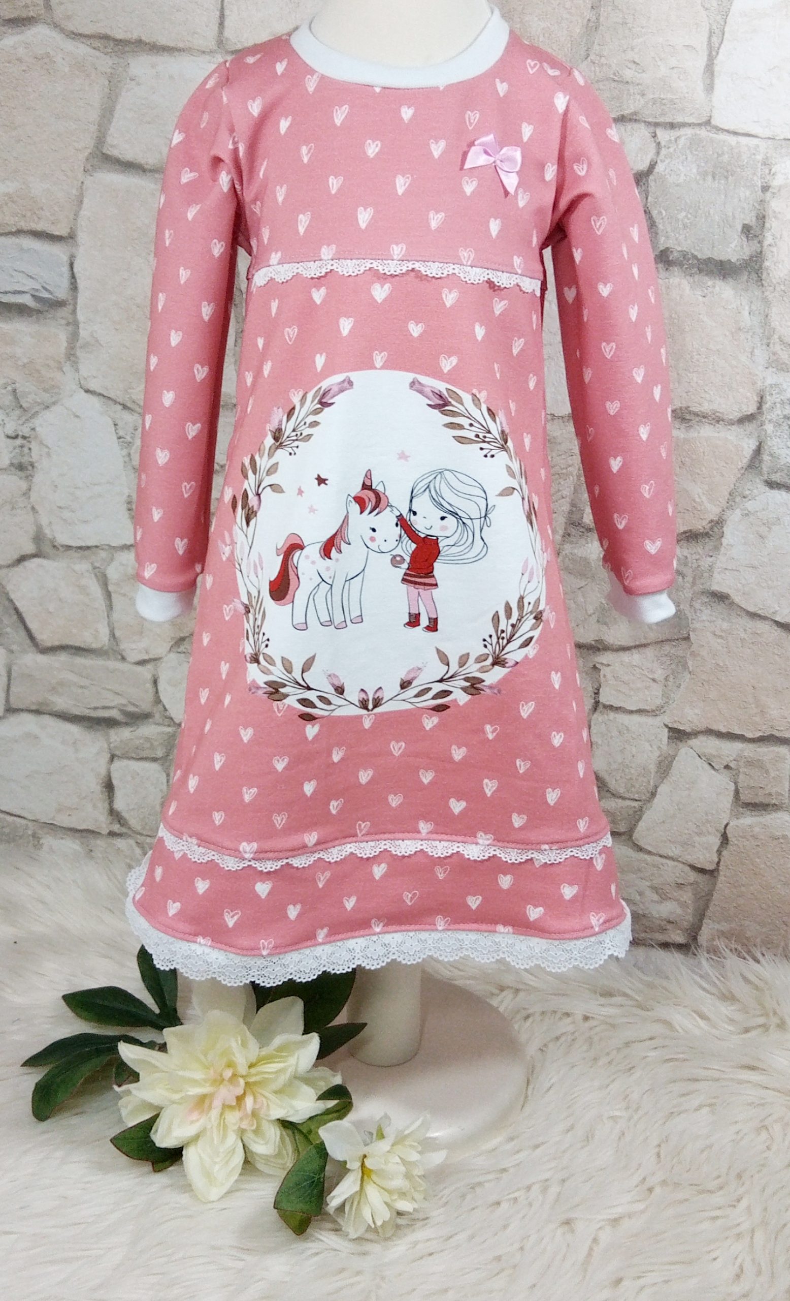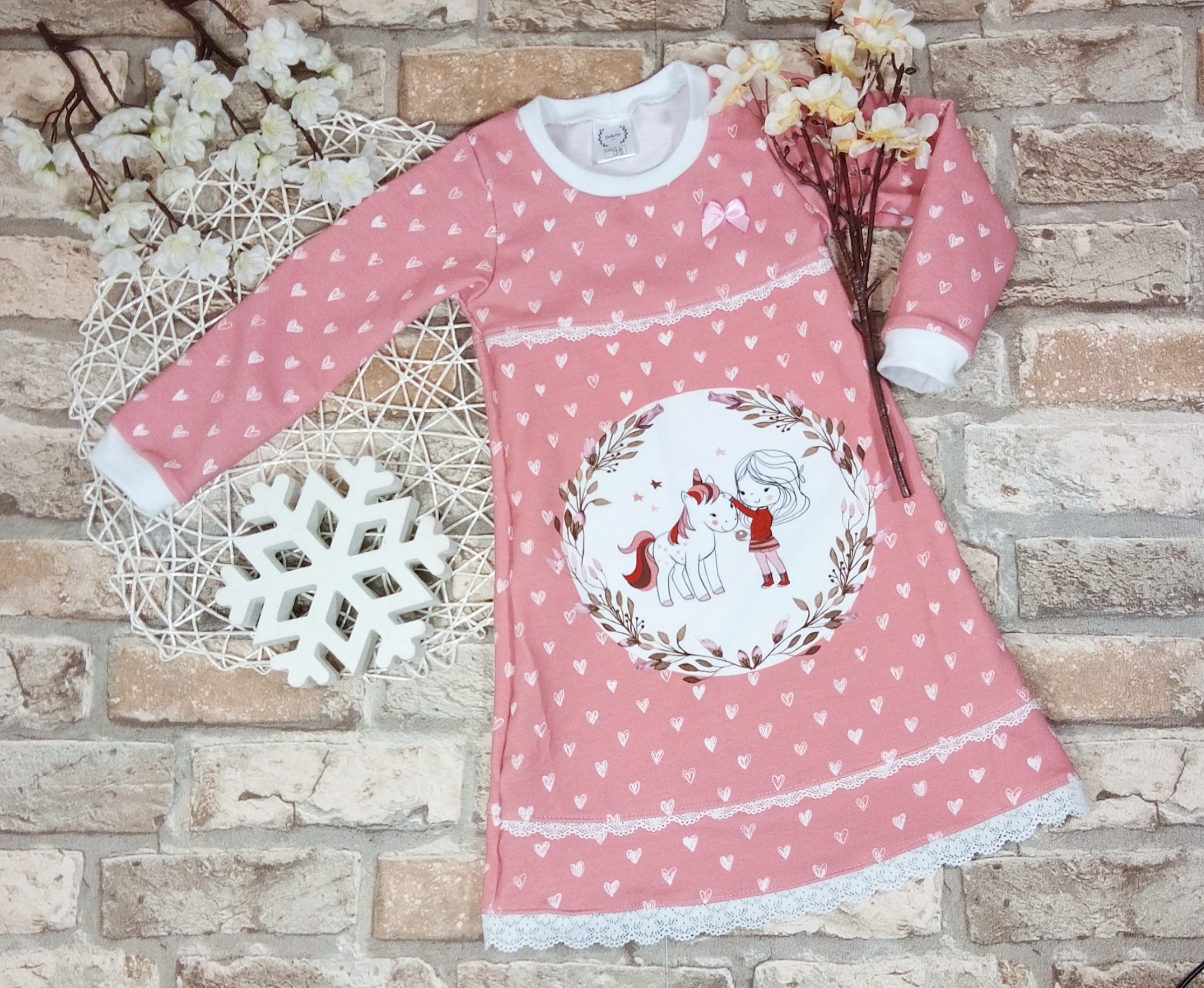 Süßes Mädchenkleid aus Baumwolljersey, dass mit einem Spitzenband gesäumt wurde.