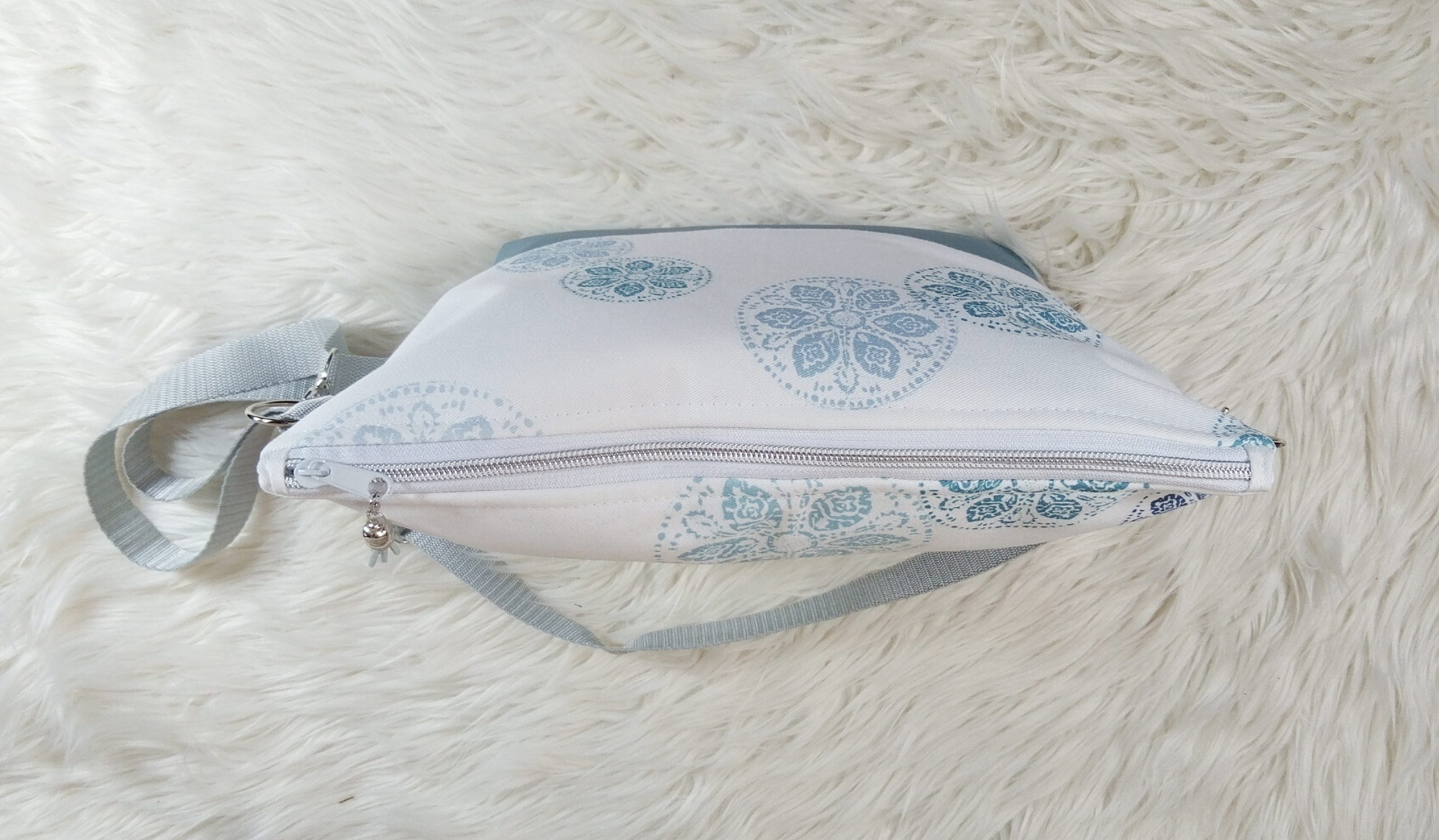 Gefüttert ist die Tasche mit einem grauen Baumwollstoff und verfügt über zwei Innenfächer mit Druckknopf, um kleine Dinge wie z.B. Handy, Schlüssel etc. verstauen zu können. Die Taschenträger aus farblich passendem Gurtband sind verstellbar und verschlossen wird die Tasche mit einem Reißverschluss.