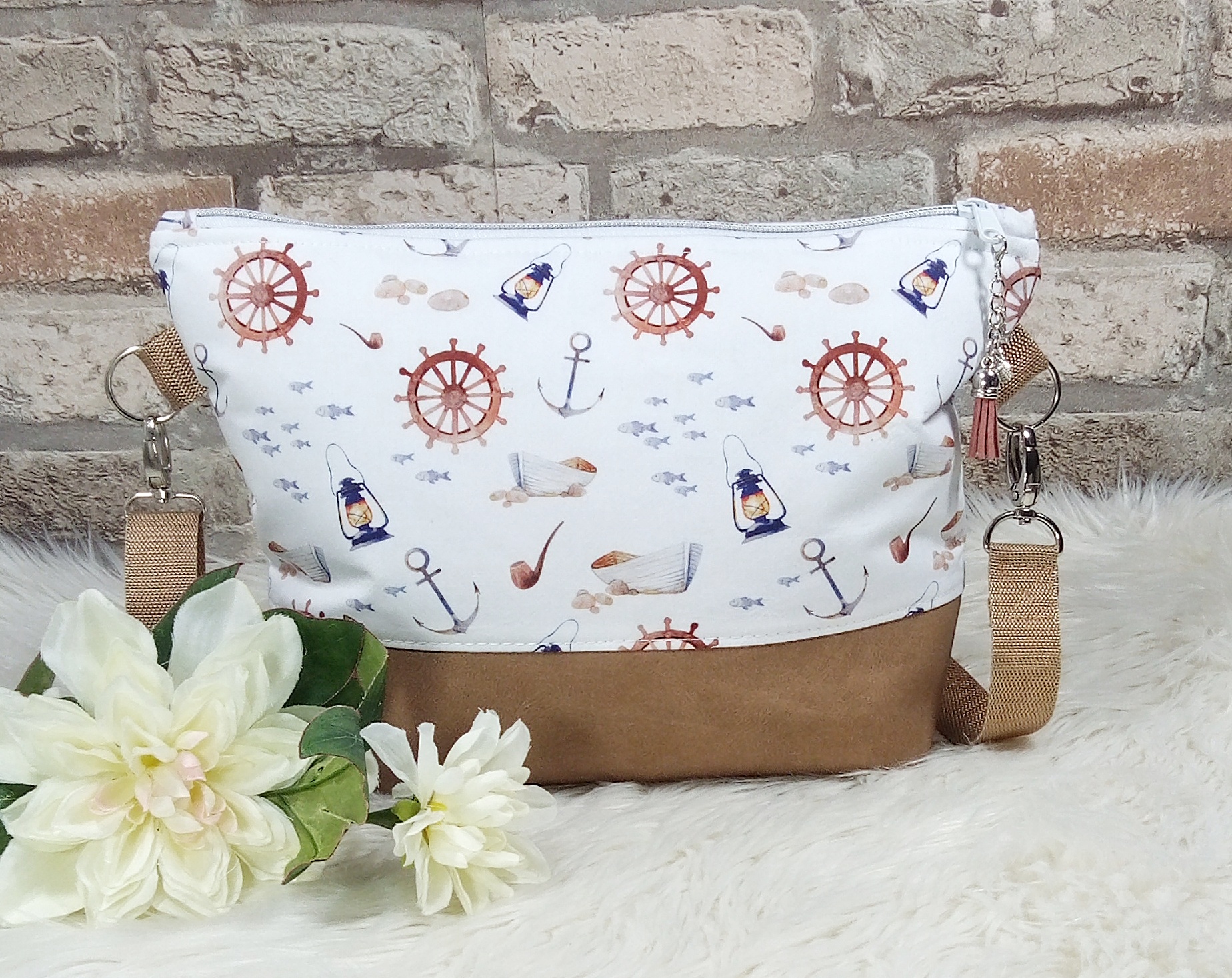 Gefüttert ist die Tasche mit einem braunen Baumwollstoff und verfügt über zwei Innenfächer mit Druckknopf, um kleine Dinge wie z.B. Handy, Schlüssel etc. verstauen zu können. Die Taschenträger aus farblich passendem Gurtband sind verstellbar und verschlossen wird die Tasche mit einem Reißverschluss.
