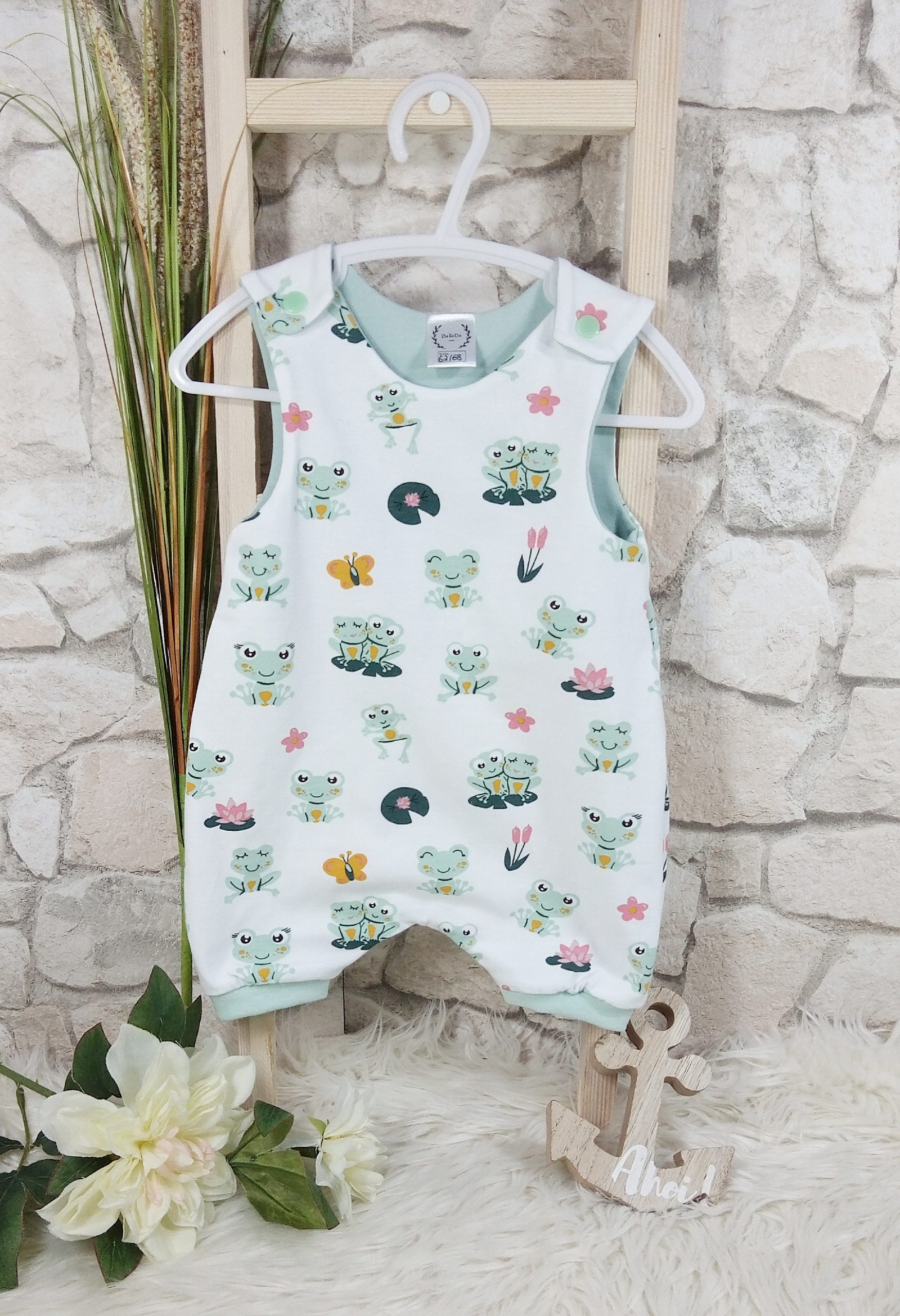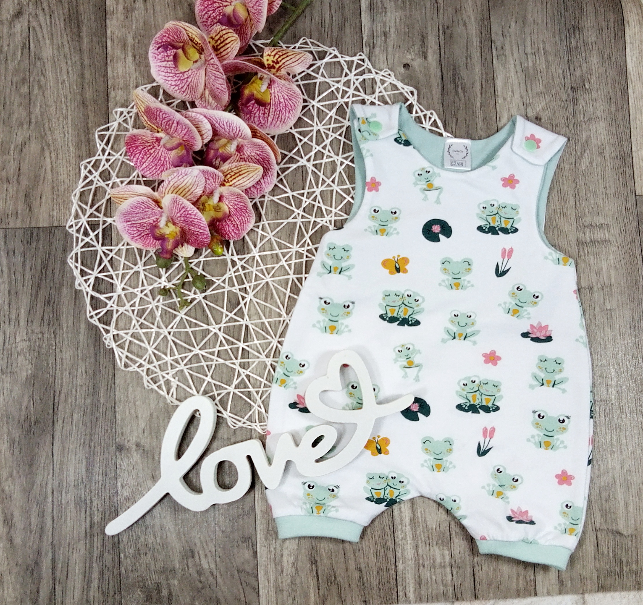 Sehr bequemer Strampler aus Baumwolljersey, der an den Schultern mit Druckknöpfen verschlossen wird. Ideal für die warmen Sommertage.