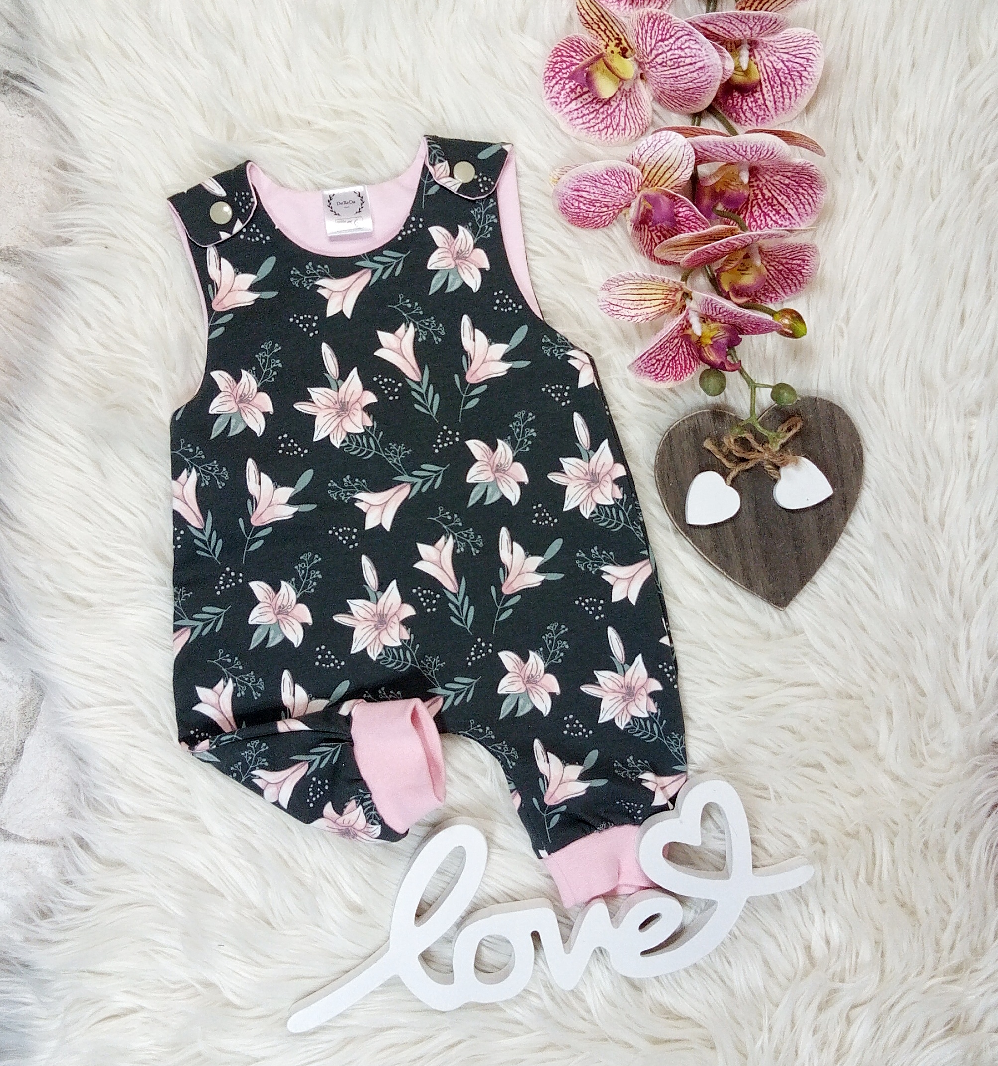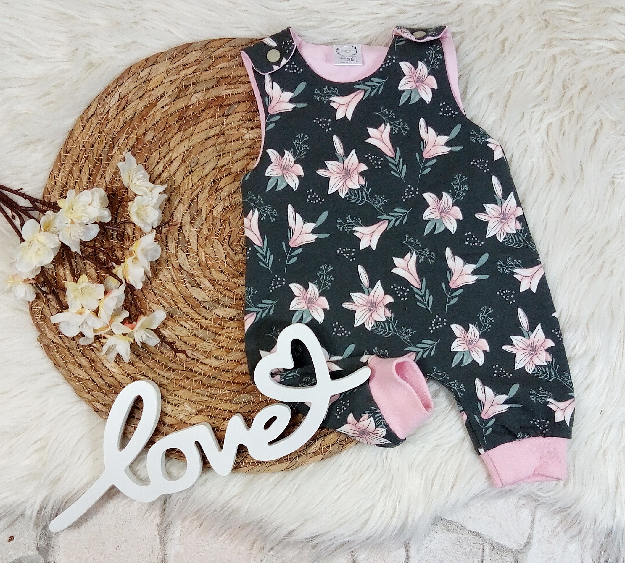 Sehr bequemer Strampler aus Baumwolljersey, der an den Schultern mit Druckknöpfen verschlossen wird.