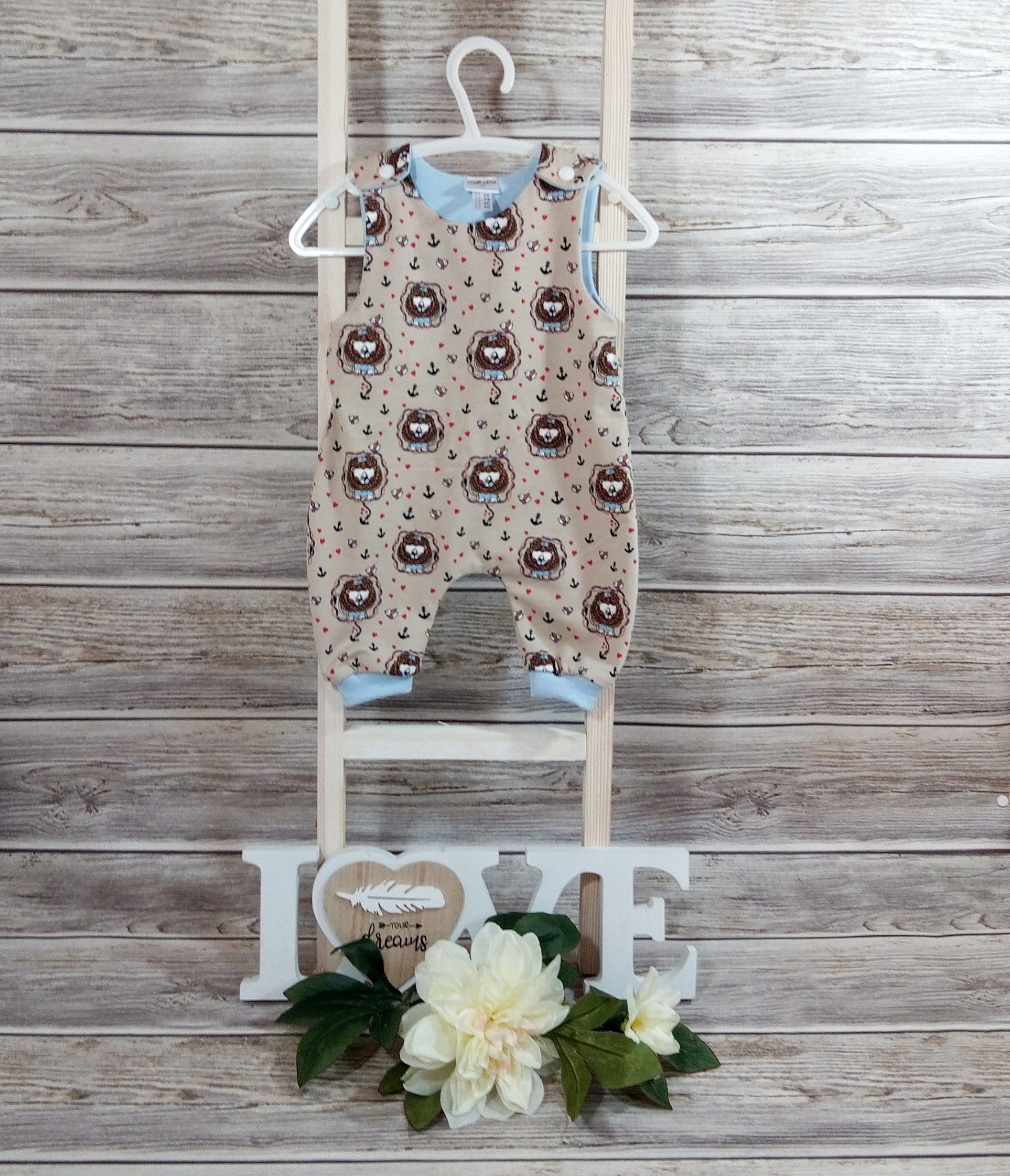 Sehr bequemer Strampler aus Baumwolljersey, der an den Schultern mit Druckknöpfen verschlossen wird.
