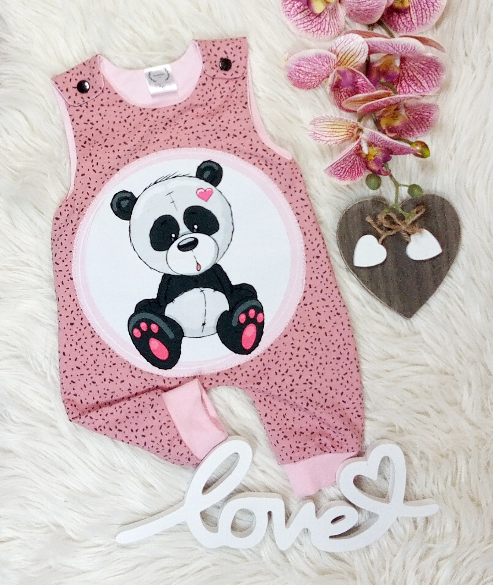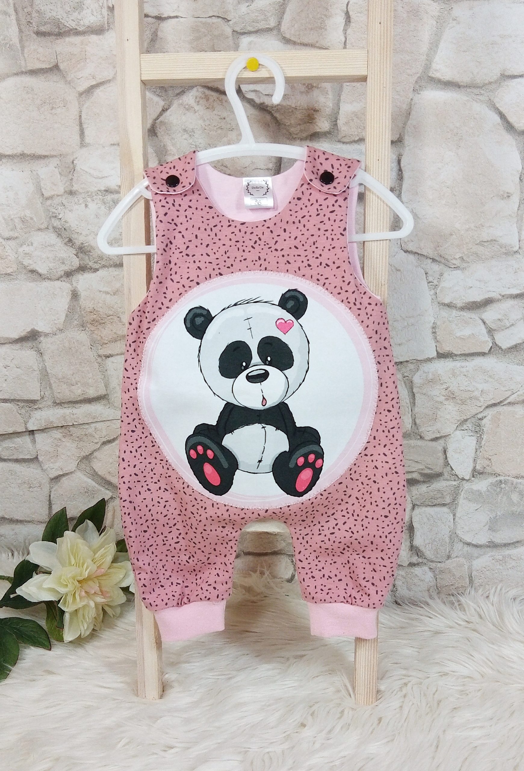Sehr bequemer Strampler aus Baumwolljersey, der an den Schultern mit Druckknöpfen verschlossen wird.
