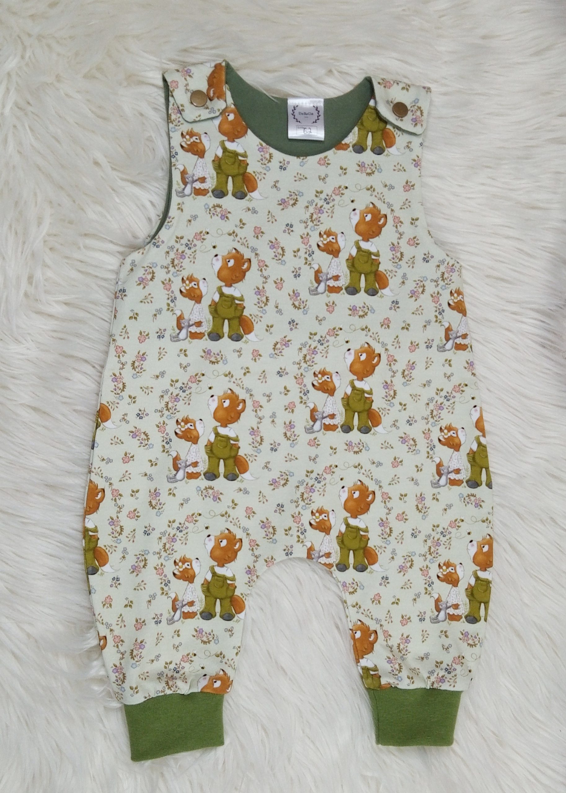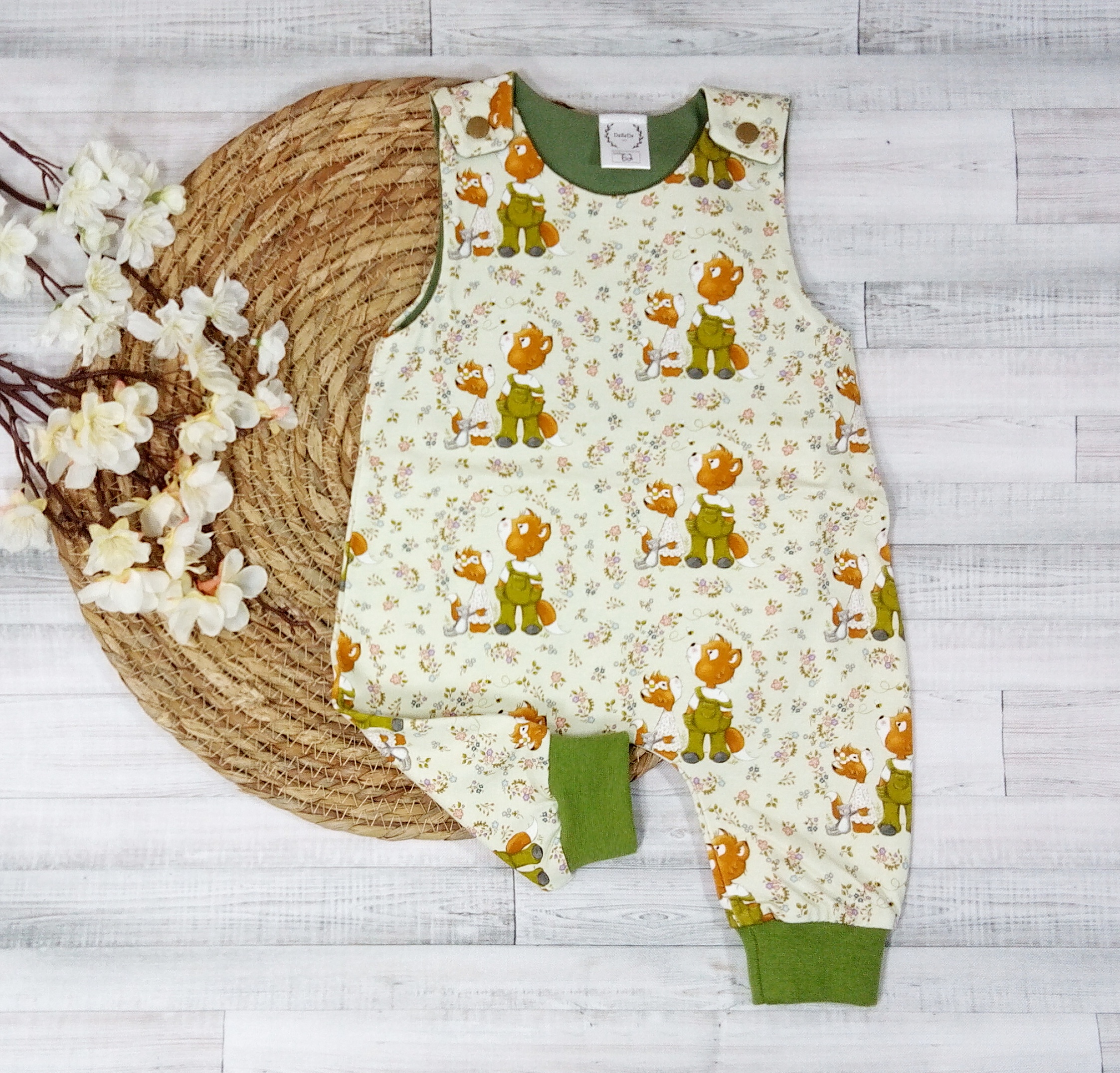 Sehr bequemer Strampler aus Baumwolljersey, der an den Schultern mit Druckknöpfen verschlossen wird.