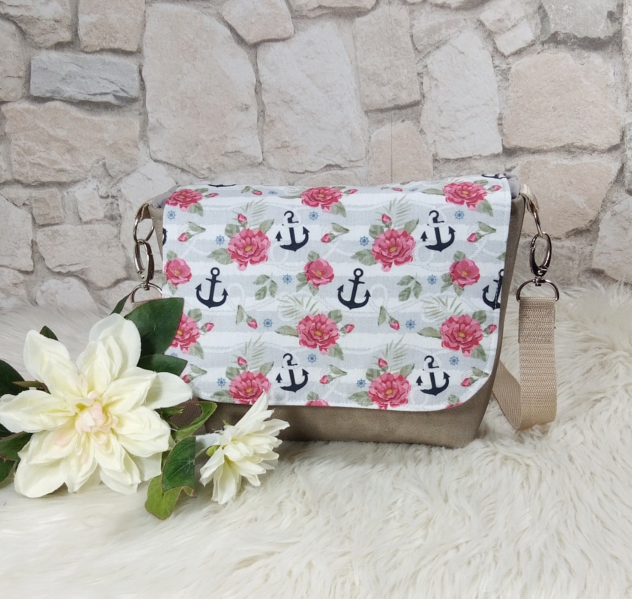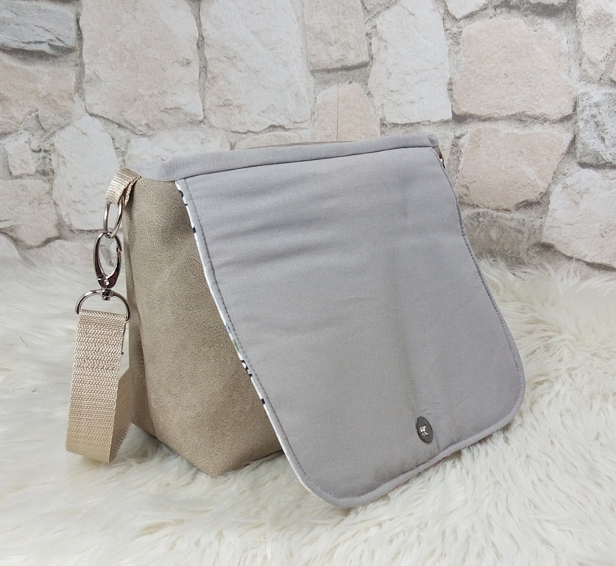 Gefüttert ist die Tasche mit einem hellgrauen Baumwollstoff und verfügt über zwei Innenfächer, die jeweils mit einem Druckknopf verschlossen werden können. Die Taschenträger aus farblich passendem Gurtband sind verstellbar und verschlossen wird die Tasche mit einem Magnetknopf an der Taschenklappe.