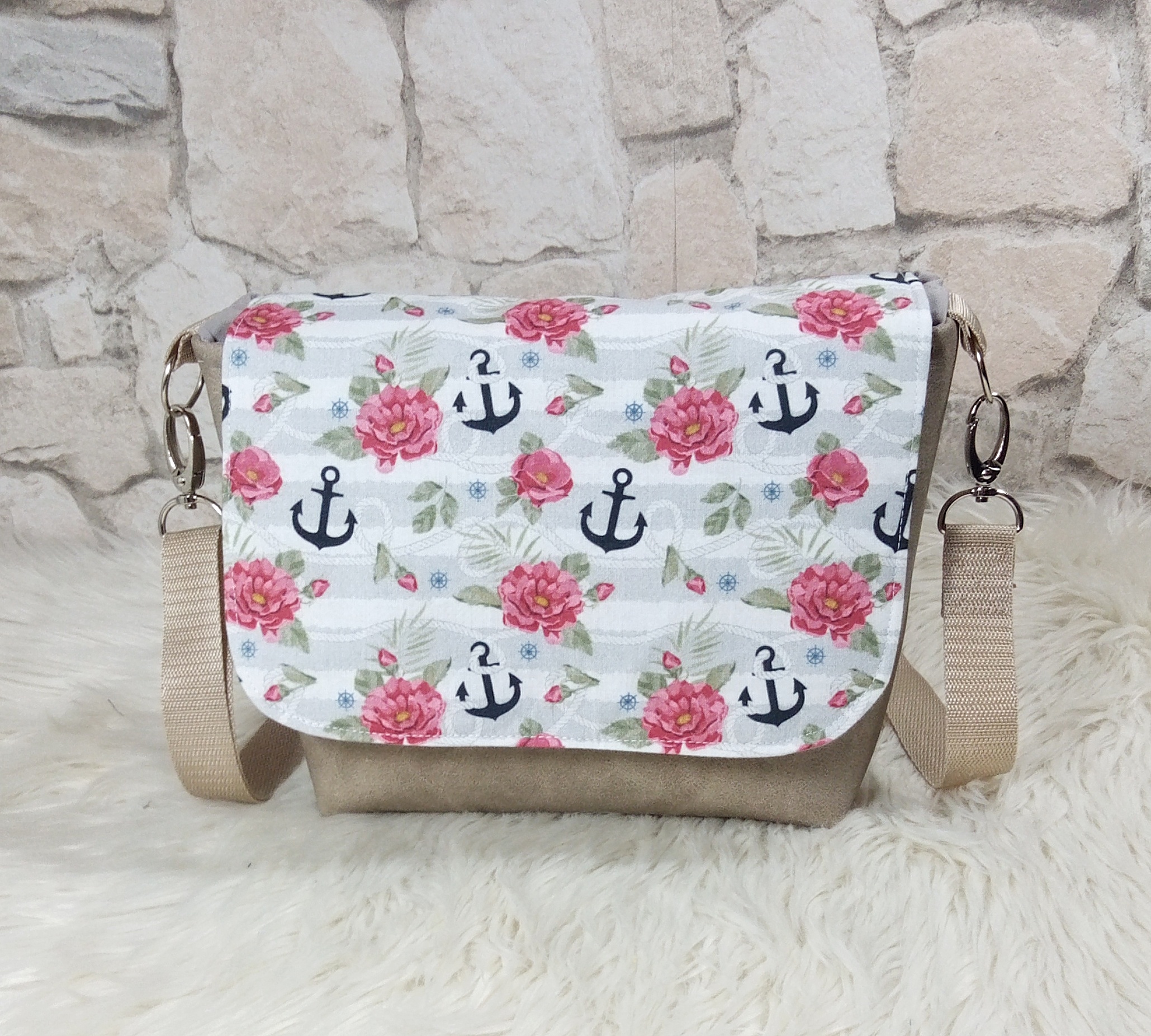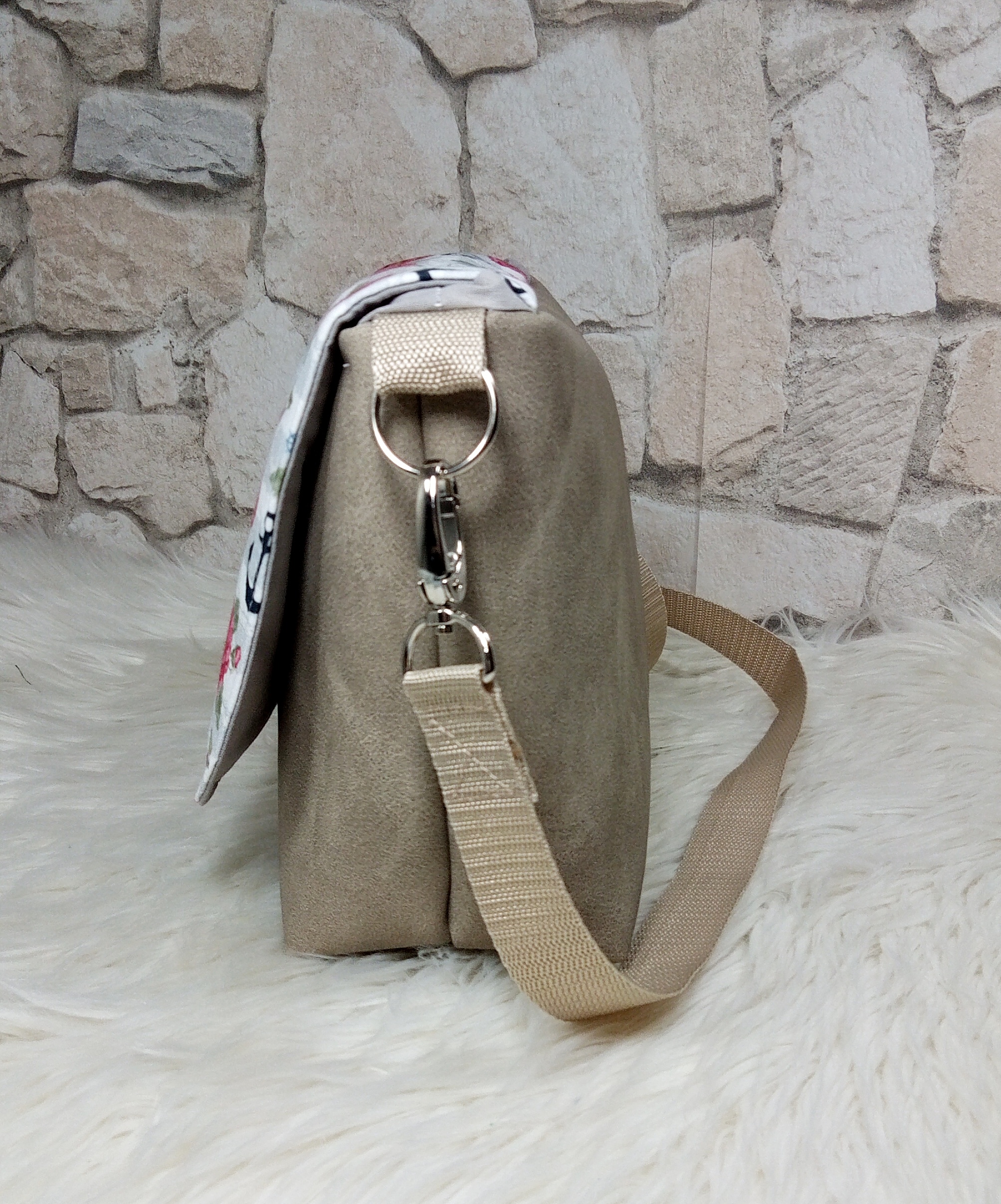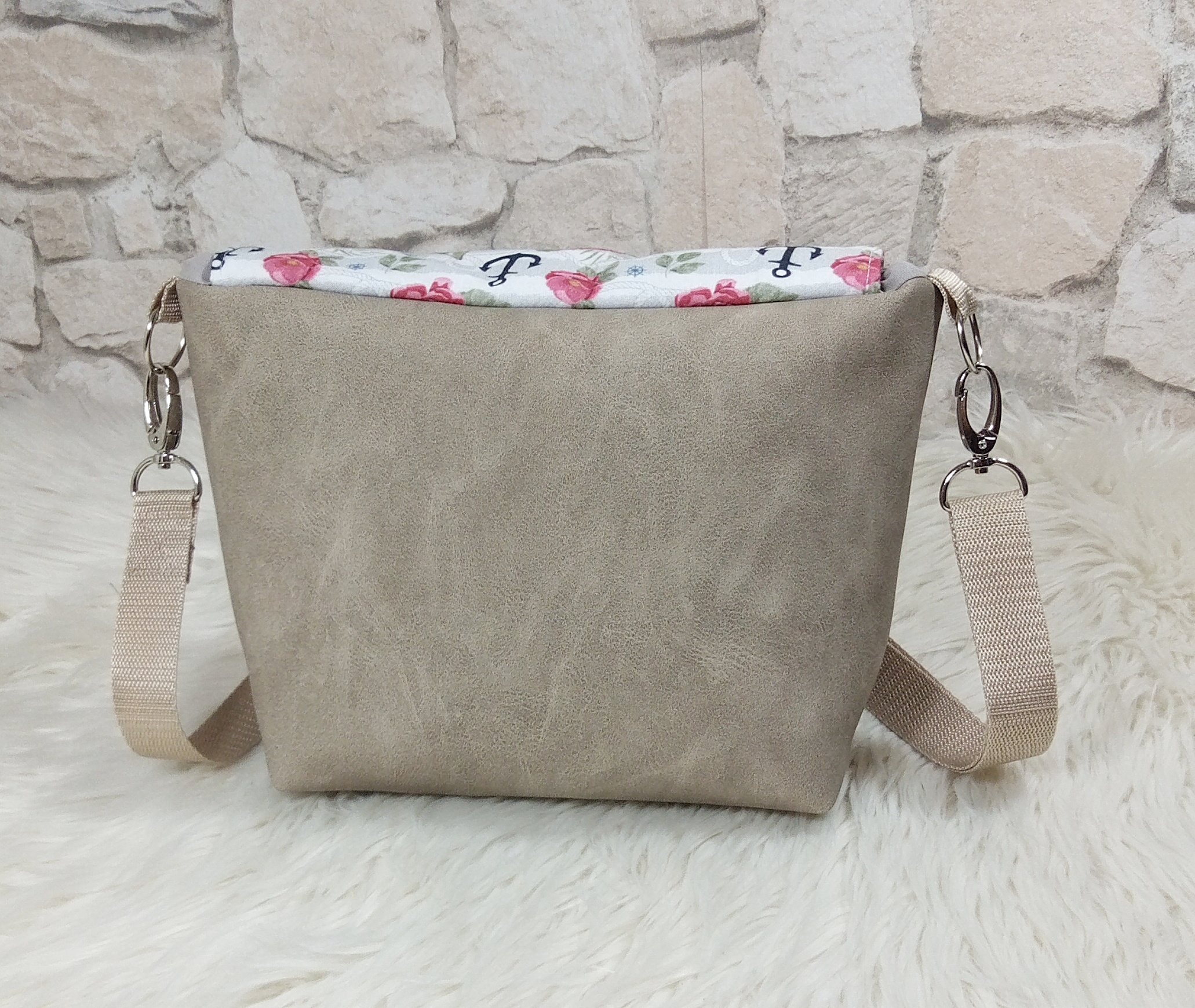 Die Tasche wurde aus Baumwolle und Kunstleder hergestellt. Verstärkt wurde sie mit einem Vlies aus Polyester, damit sie auch mit wenig Inhalt gut aussieht und Stand hat.