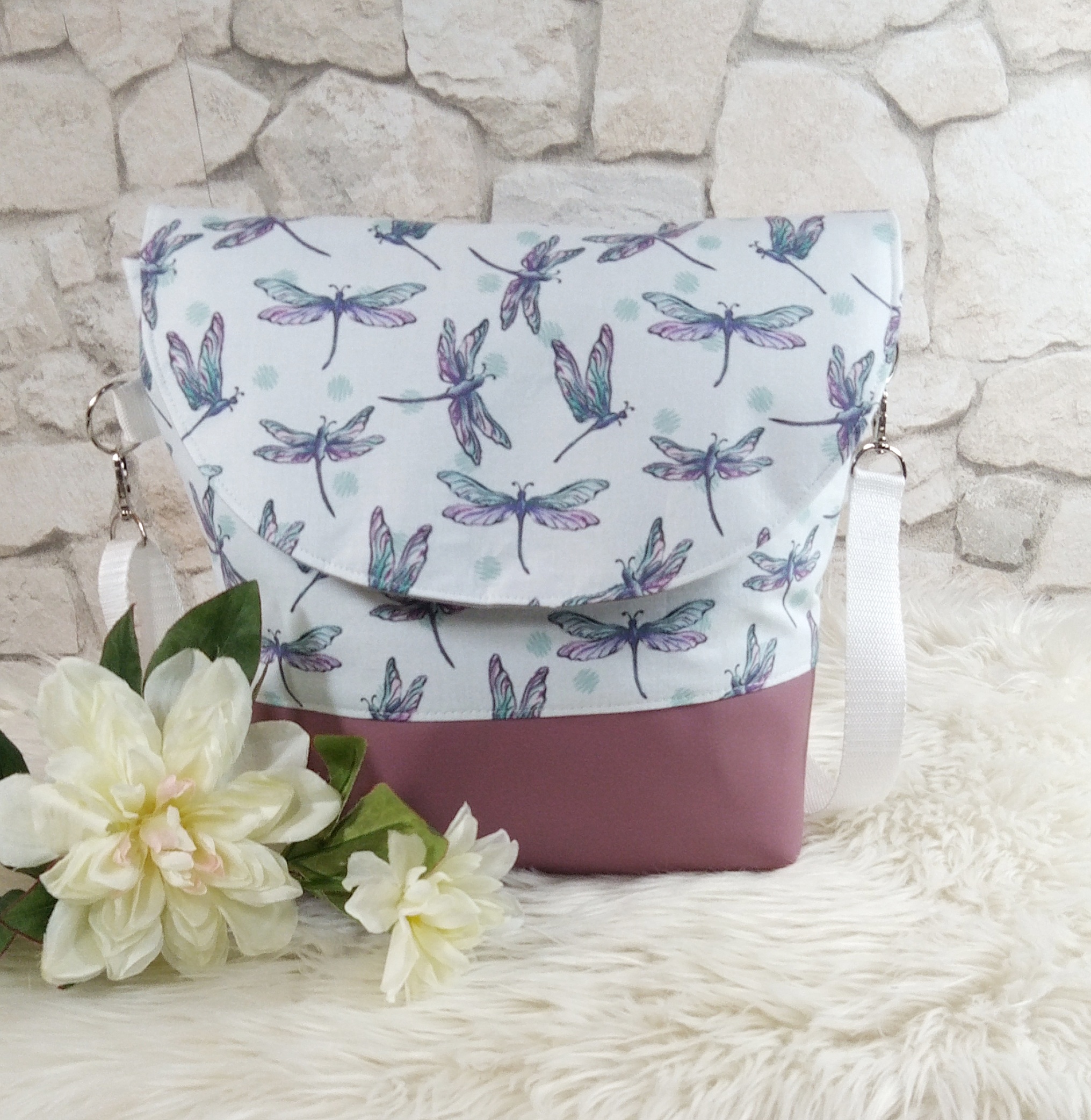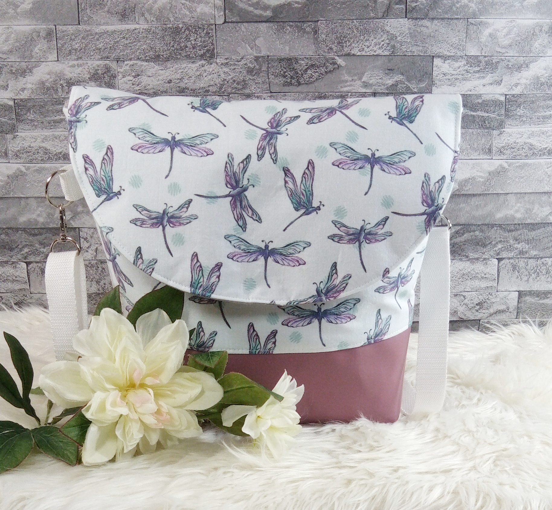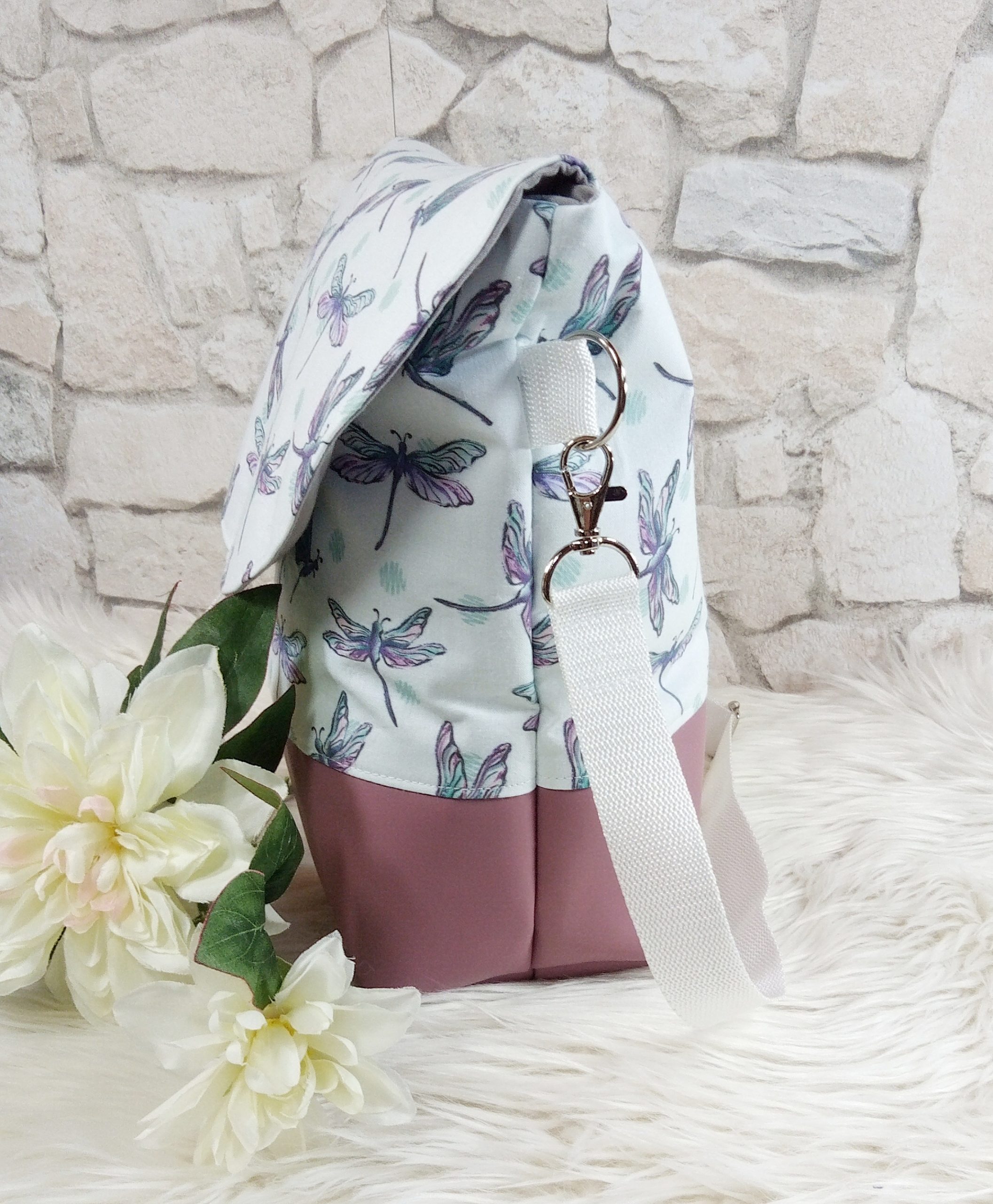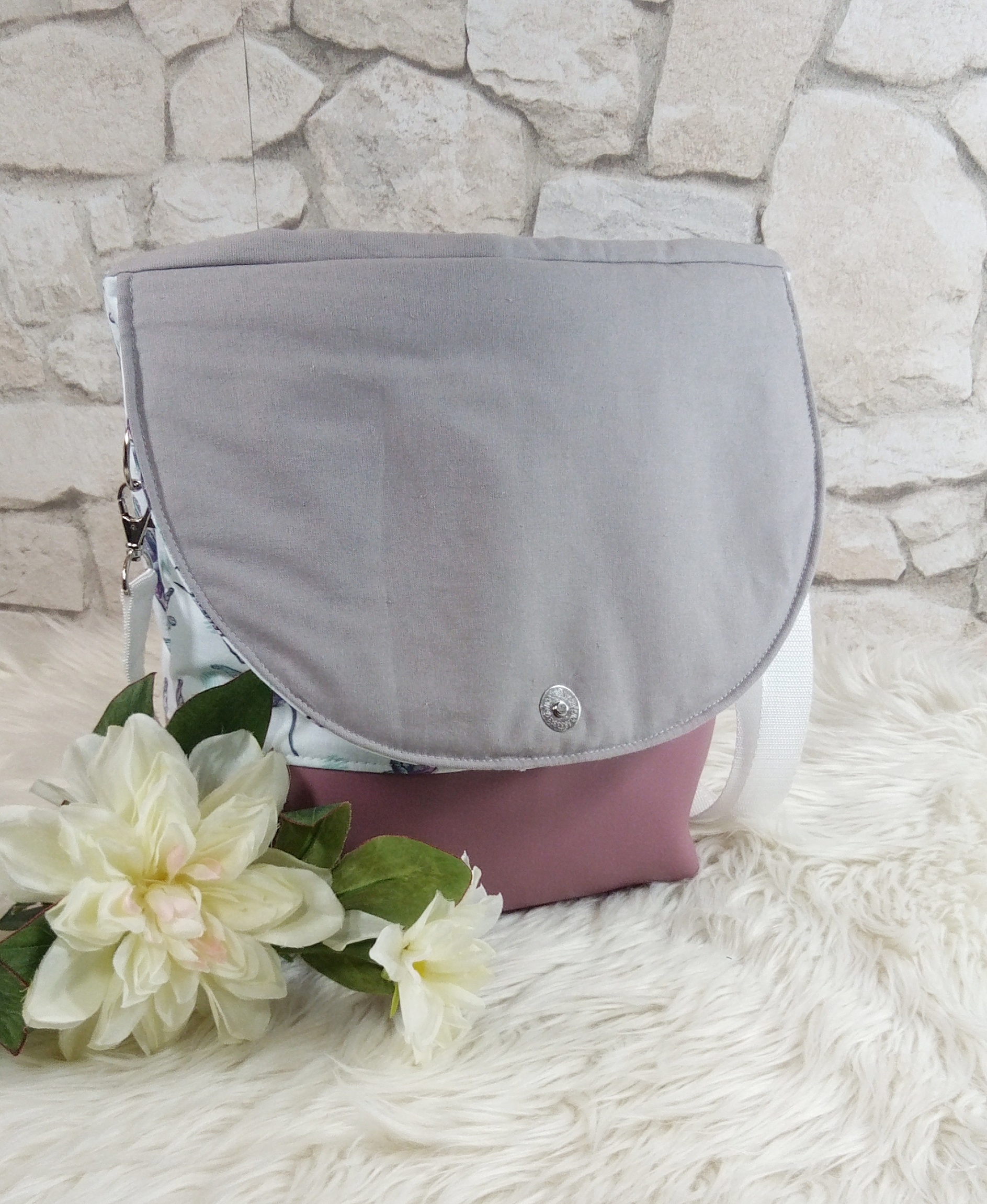 Gefüttert ist die Tasche mit einem grauen Baumwollstoff und verfügt über zwei Innenfächer mit Druckknopf, um kleine Dinge wie z.B. Handy, Schlüssel etc. verstauen zu können. Die Taschenträger aus farblich passendem Gurtband sind verstellbar und verschlossen wird die Tasche mit einem Magnetknopf an der Taschenklappe.