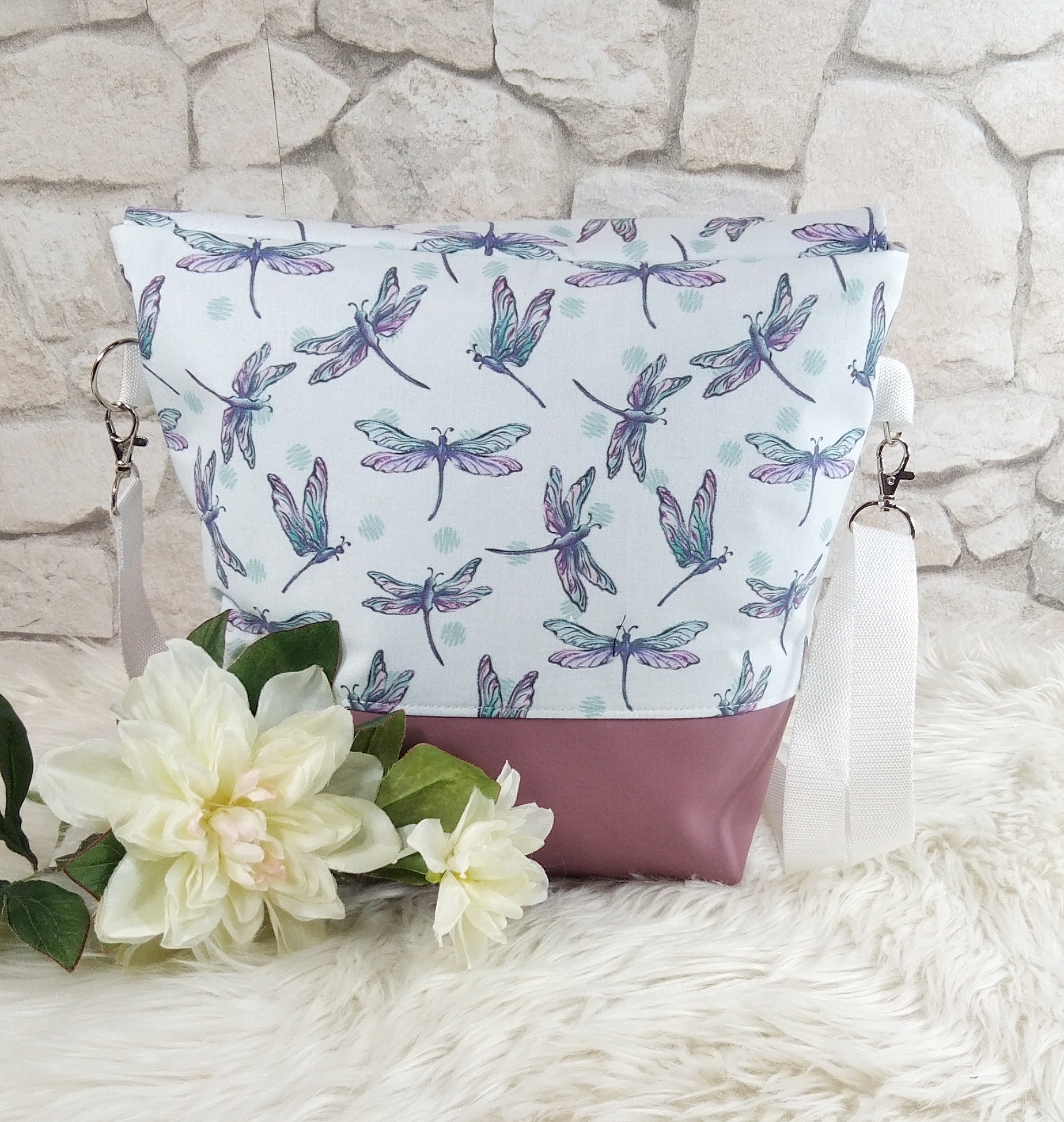 Die Tasche wurde aus Baumwolle und Kunstleder hergestellt. Verstärkt wurde sie mit einem Vlies aus Polyester, damit sie auch mit wenig Inhalt gut aussieht und Stand hat.