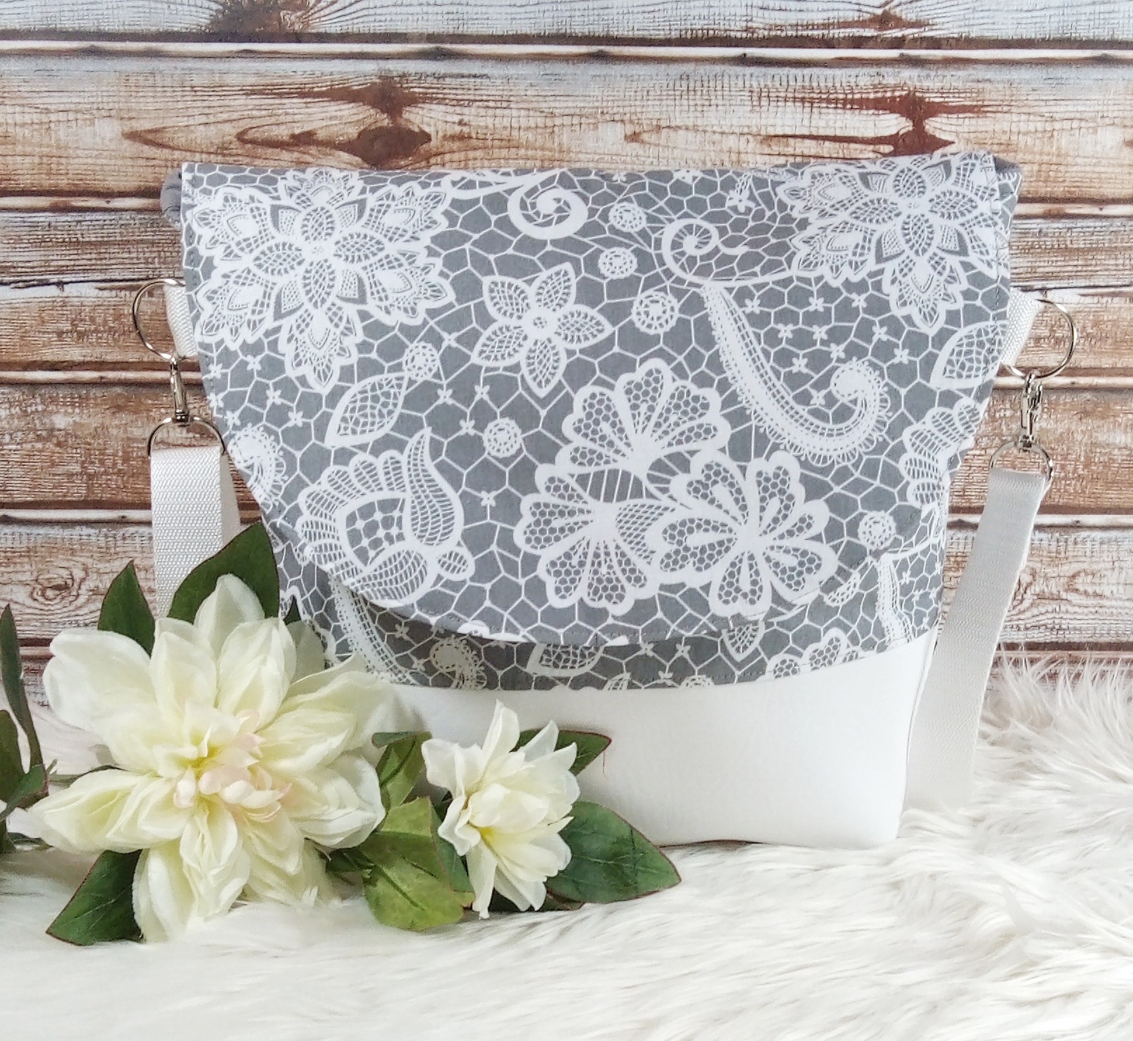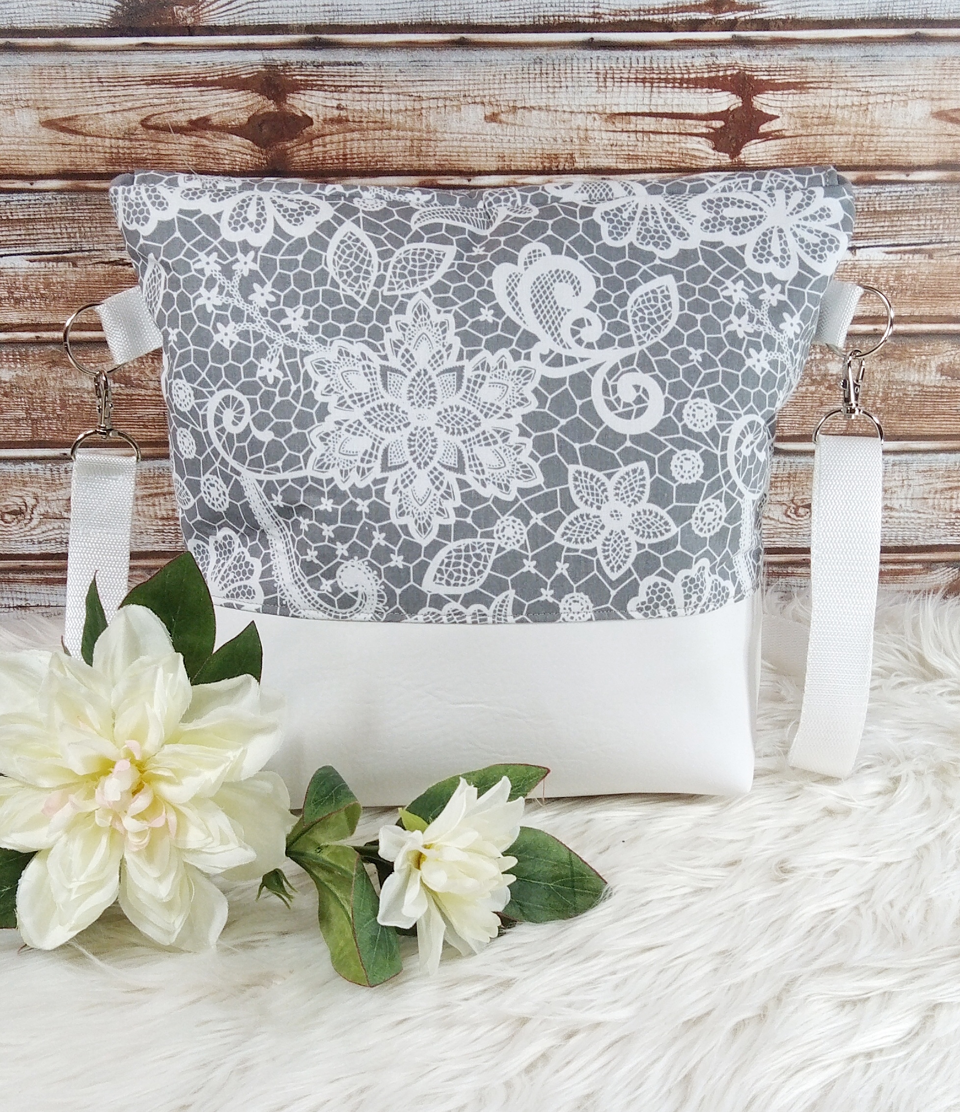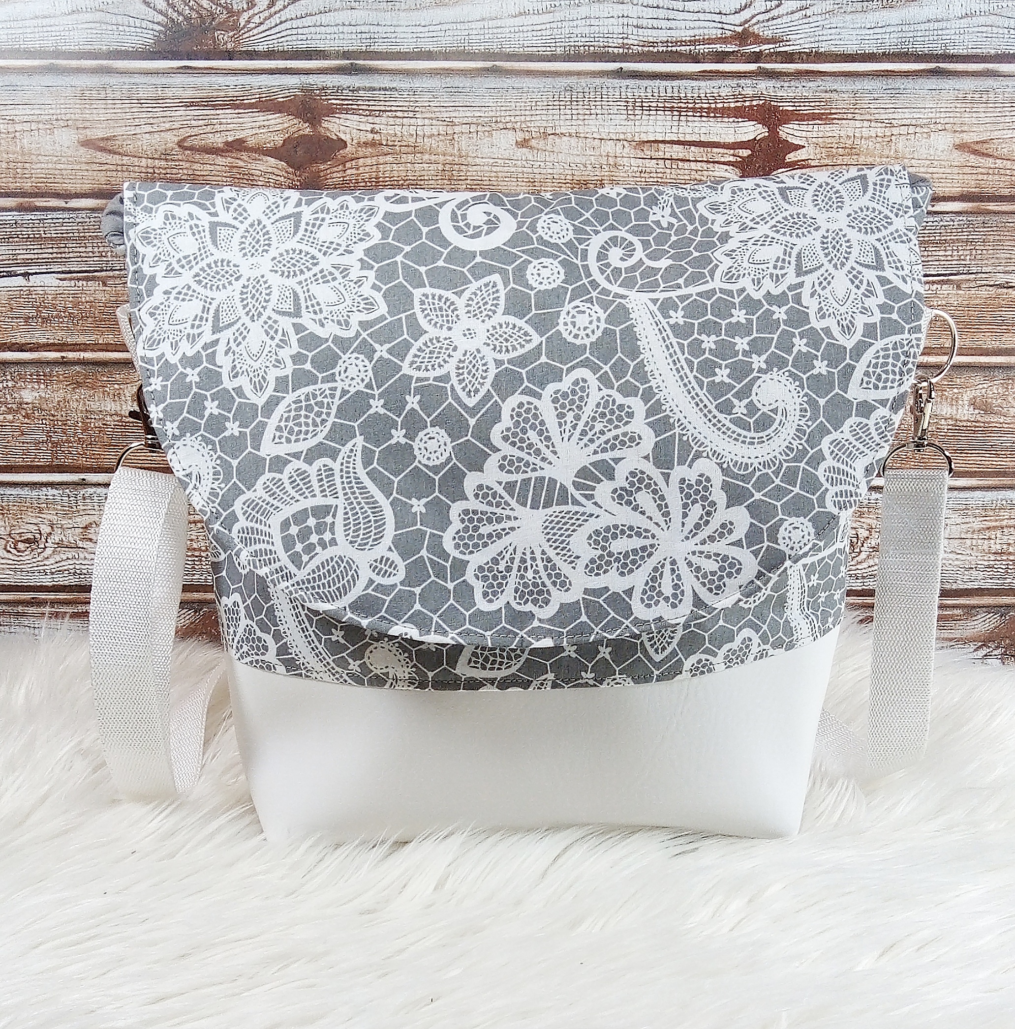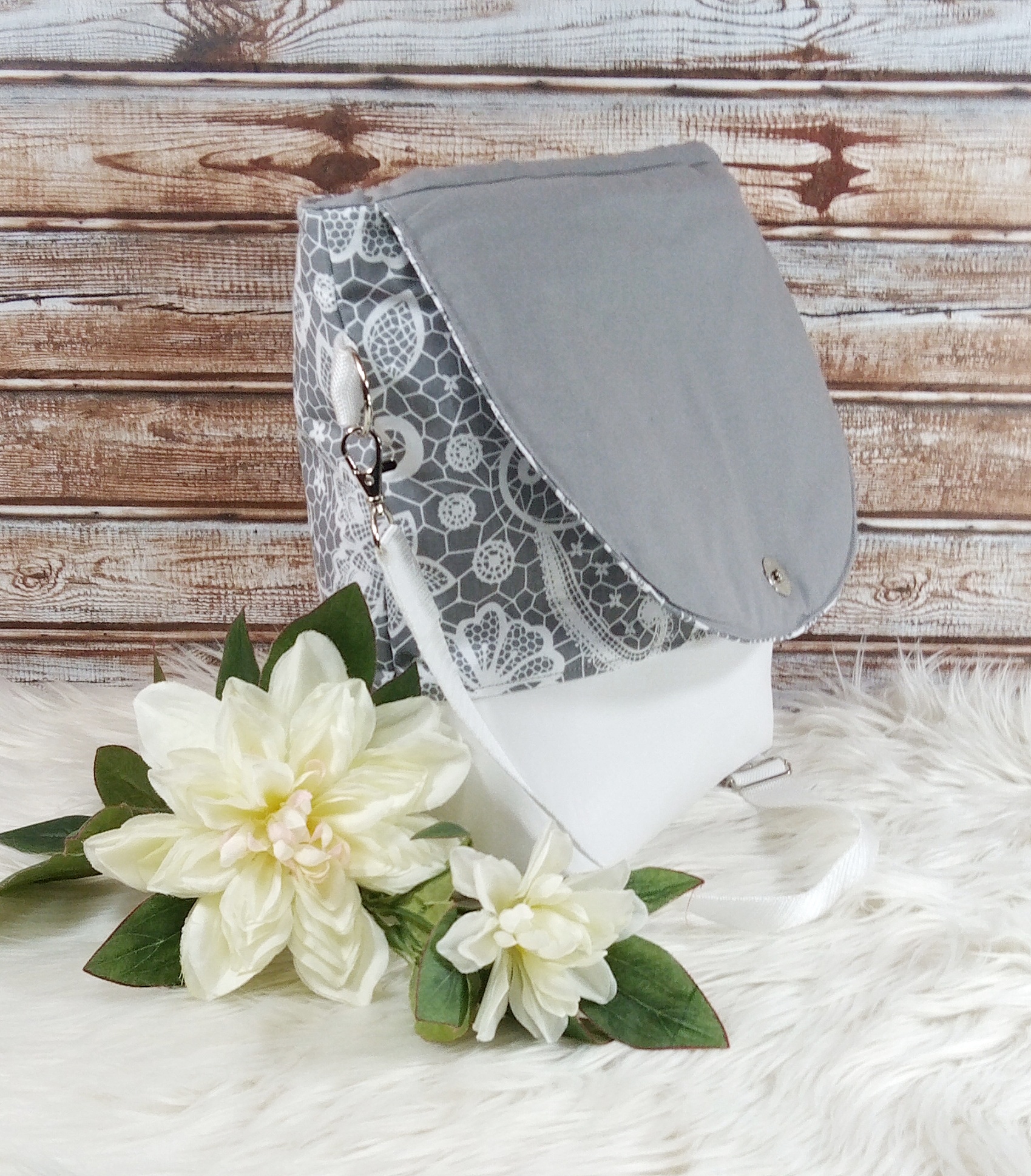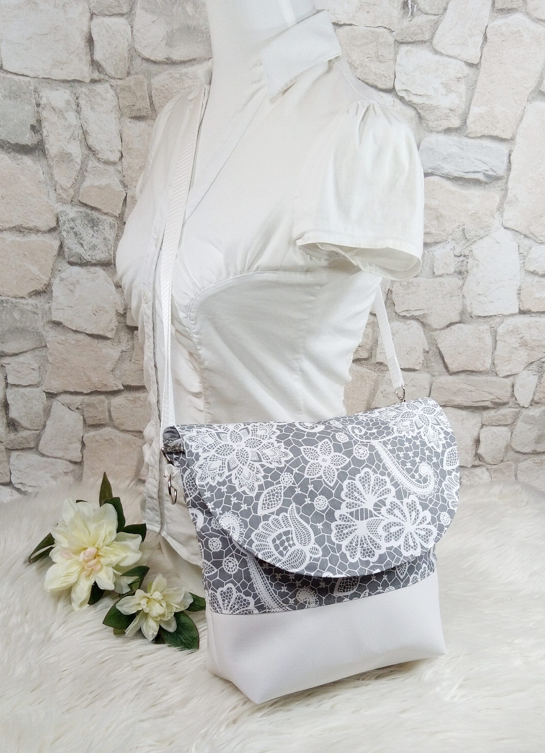 Gefüttert ist die Tasche mit einem grauen Baumwollstoff und verfügt über zwei Innenfächer mit Druckknopf, um kleine Dinge wie z.B. Handy, Schlüssel etc. verstauen zu können. Die Taschenträger aus grauem Gurtband sind verstellbar und verschlossen wird die Tasche mit einem Magnetknopf an der Taschenklappe.