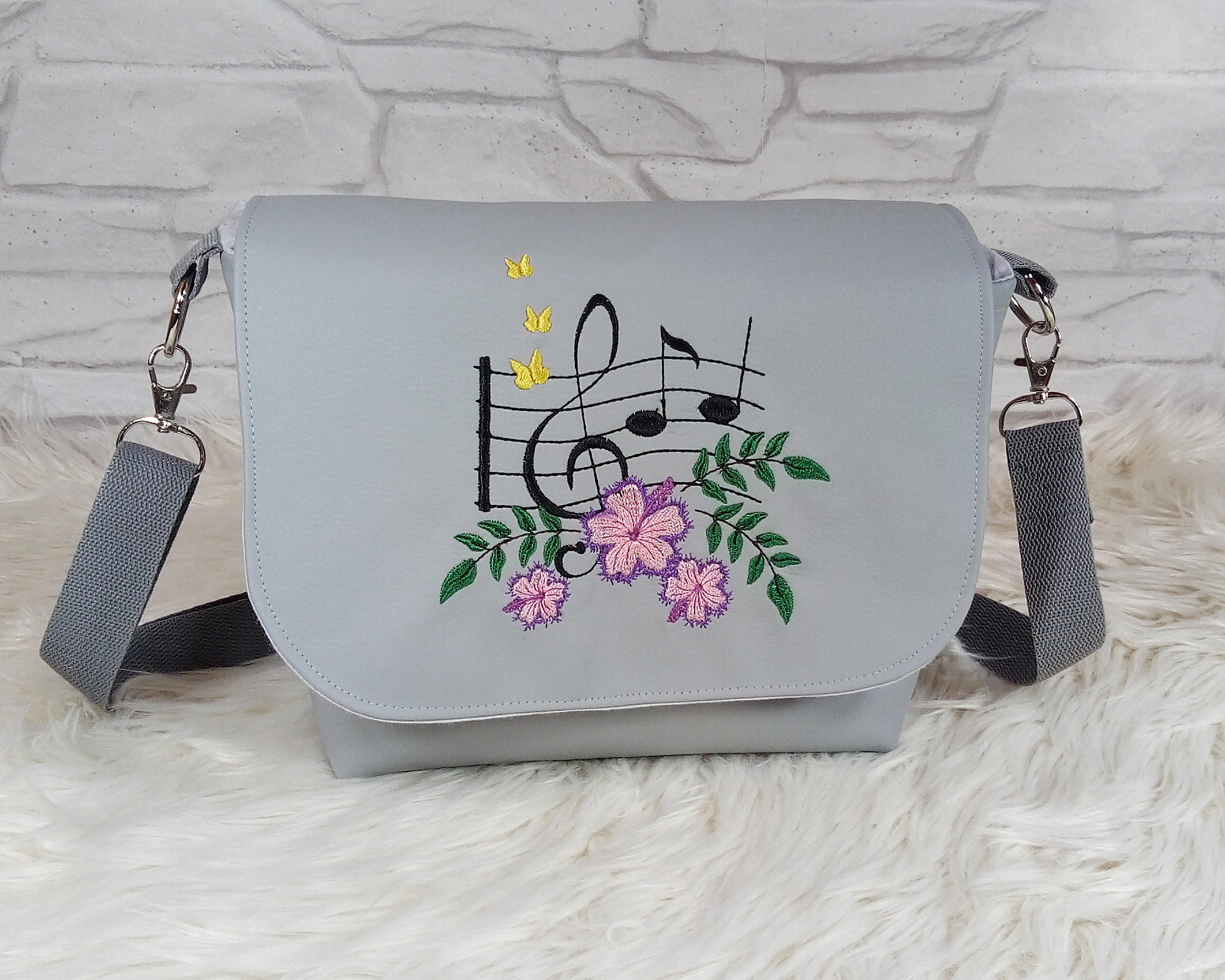 Die Tasche wurde aus Baumwolle und Kunstleder hergestellt. Verstärkt wurde sie mit einem Vlies aus Polyester, damit sie auch mit wenig Inhalt gut aussieht und Stand hat. Zusätzlich ist sie mit einer aufwendigen Stickerei auf der Taschenklappe verziert.