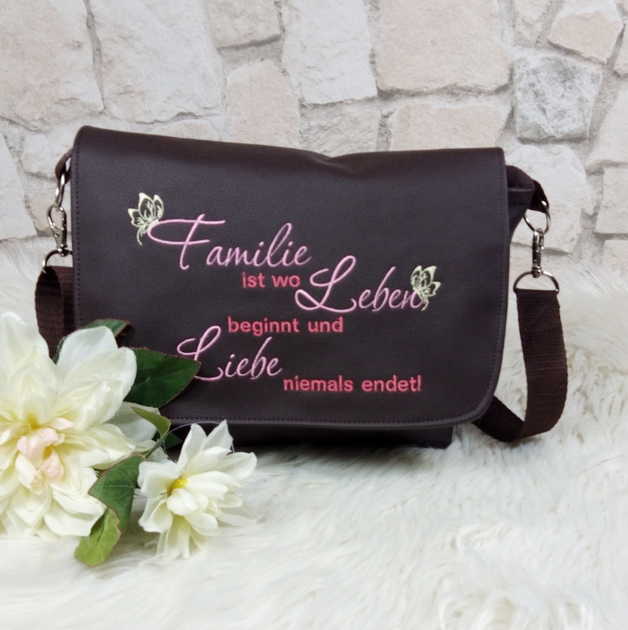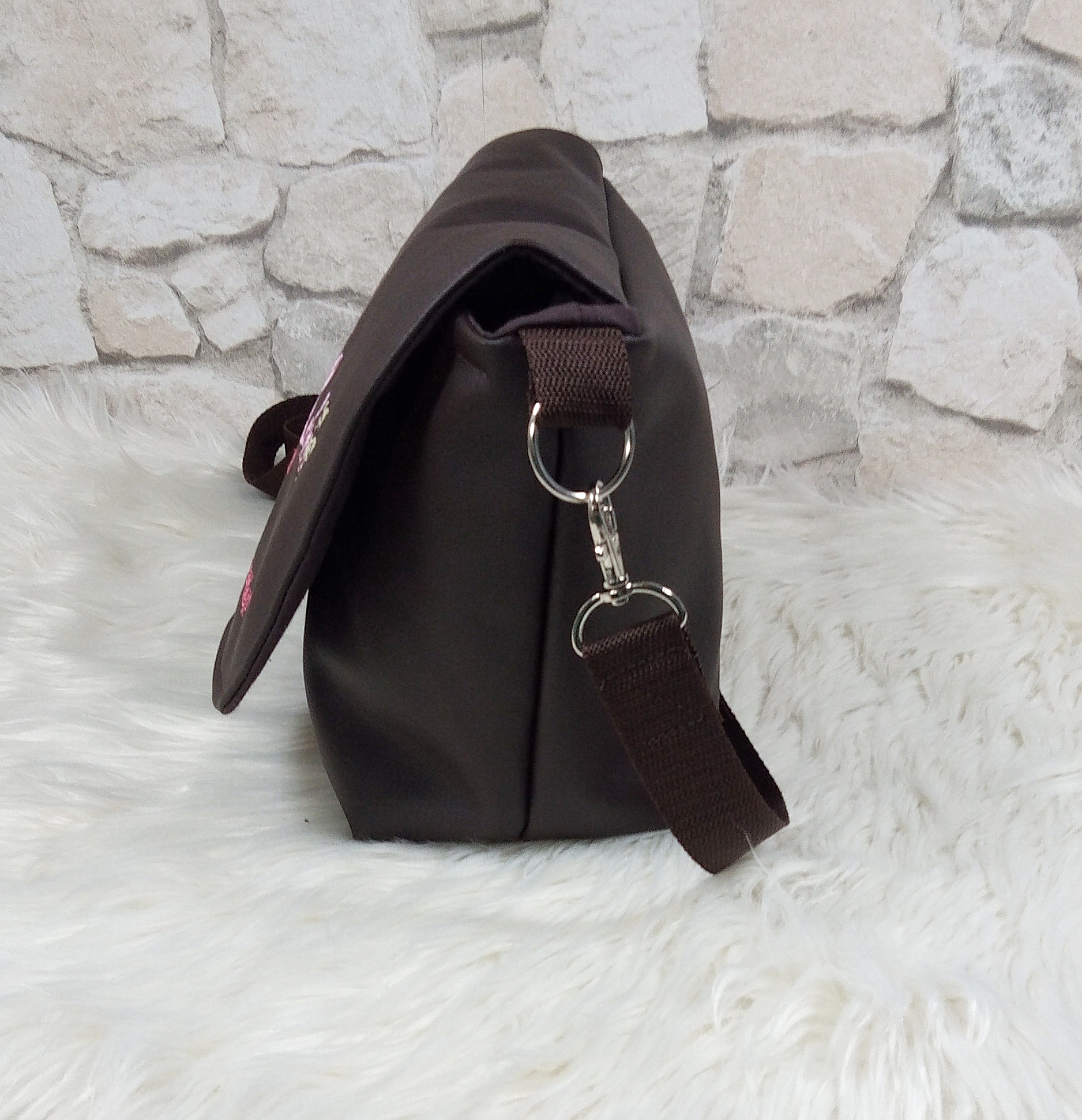 Die Tasche wurde aus Baumwolle und Kunstleder hergestellt. Verstärkt wurde sie mit einem Vlies aus Polyester, damit sie auch mit wenig Inhalt gut aussieht und Stand hat. Zusätzlich ist sie mit einer aufwendigen Stickerei auf der Taschenklappe verziert.