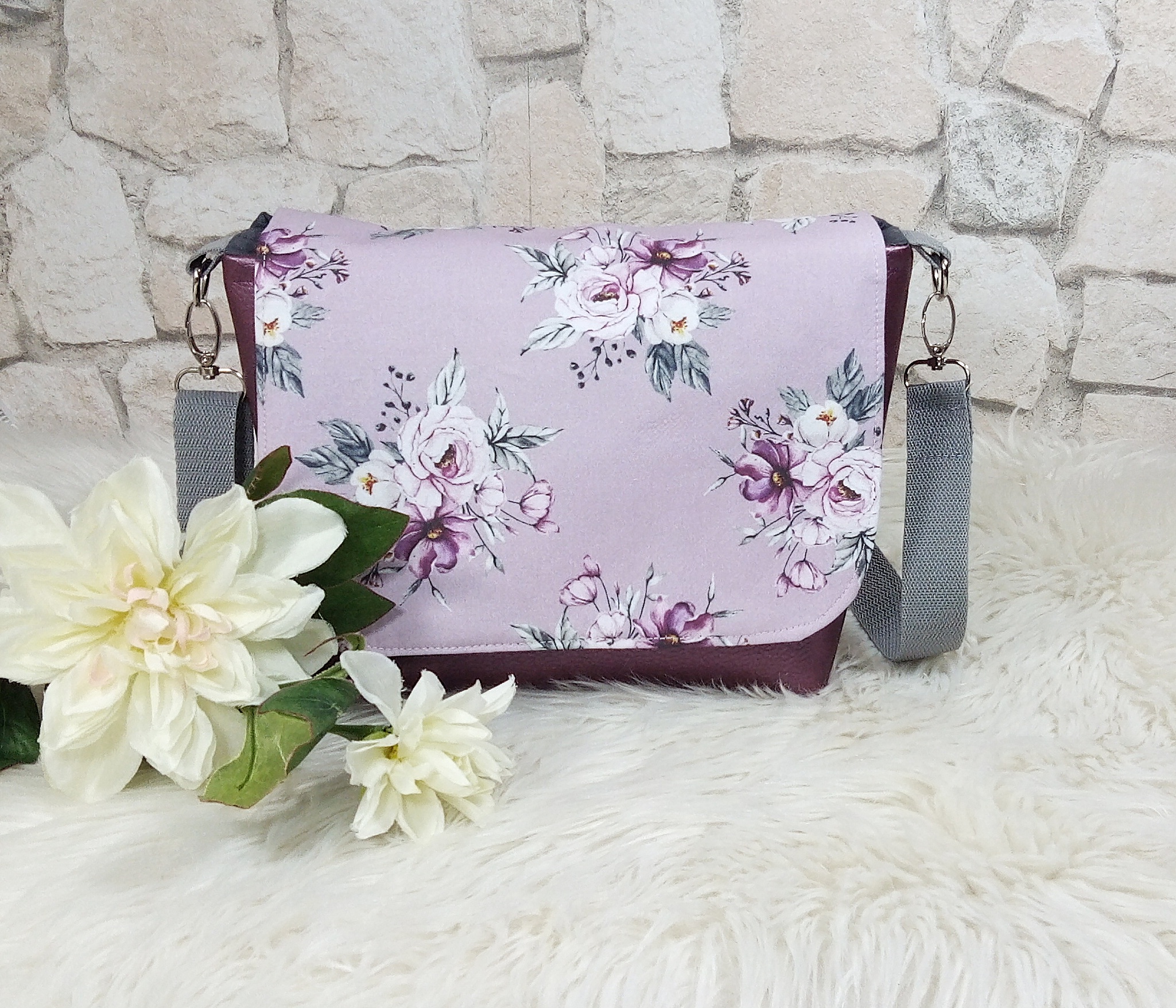 Gefüttert ist die Tasche mit einem grauen Baumwollstoff und verfügt über zwei Innenfächer, die jeweils mit einem Druckknopf verschlossen werden können. Die Taschenträger aus farblich passendem Gurtband sind verstellbar und verschlossen wird die Tasche mit einem Magnetknopf an der Taschenklappe.