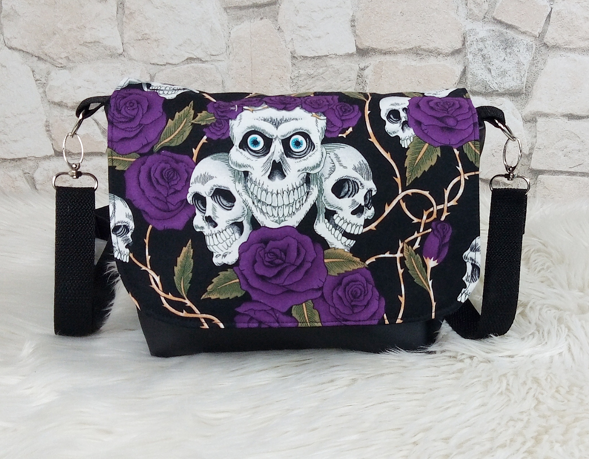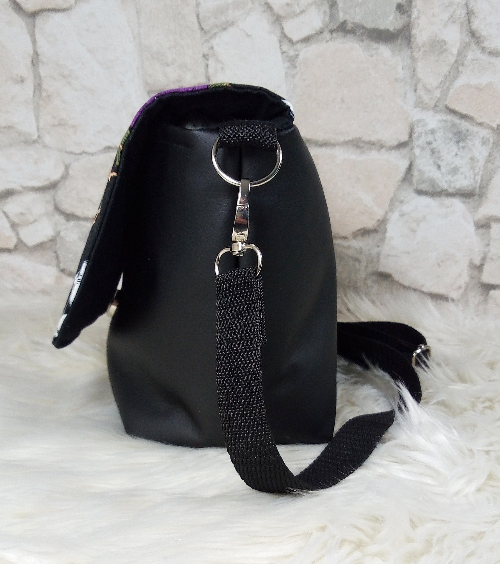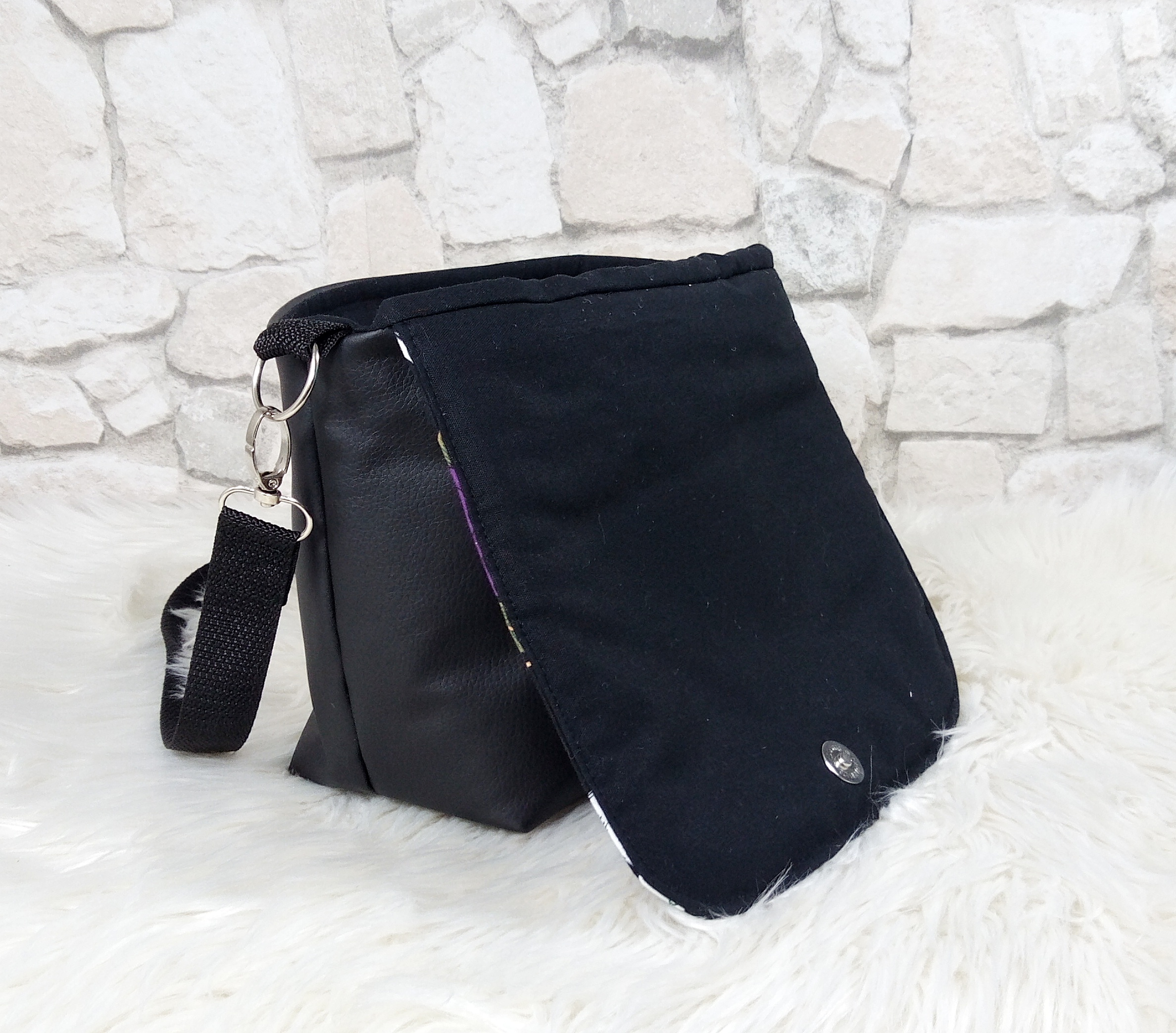 Gefüttert ist die Tasche mit einem schwarzen Baumwollstoff und verfügt über zwei Innenfächer, die jeweils mit einem Druckknopf verschlossen werden können. Die Taschenträger aus schwarzem Gurtband sind verstellbar und verschlossen wird die Tasche mit einem Magnetknopf an der Taschenklappe.