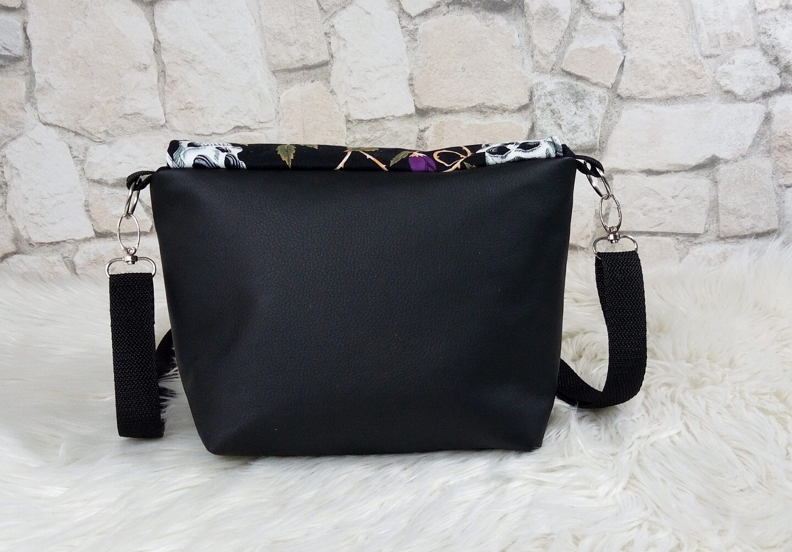 Die Tasche wurde aus Baumwolle und Kunstleder hergestellt. Verstärkt wurde sie mit einem Vlies aus Polyester, damit sie auch mit wenig Inhalt gut aussieht und Stand hat.