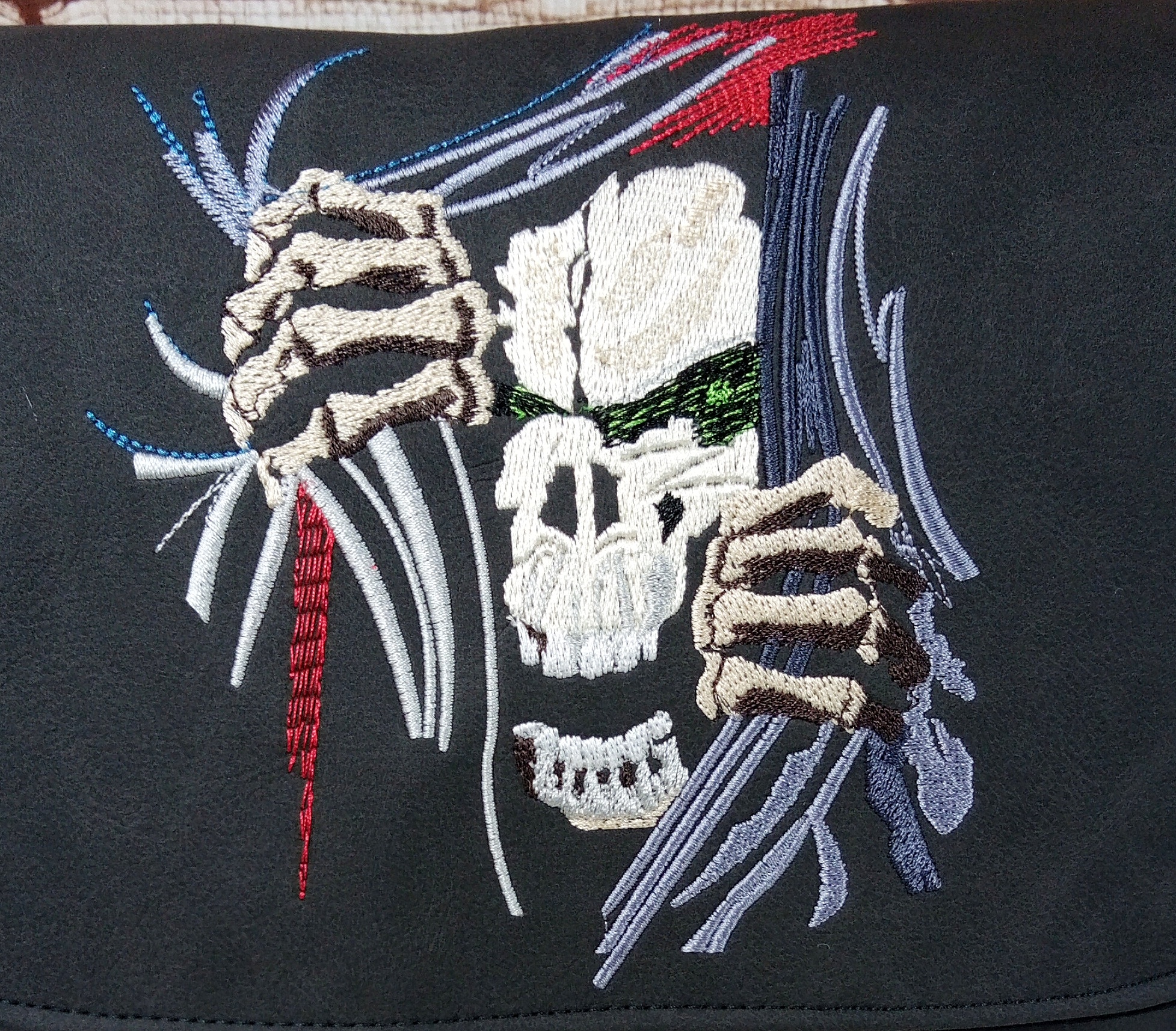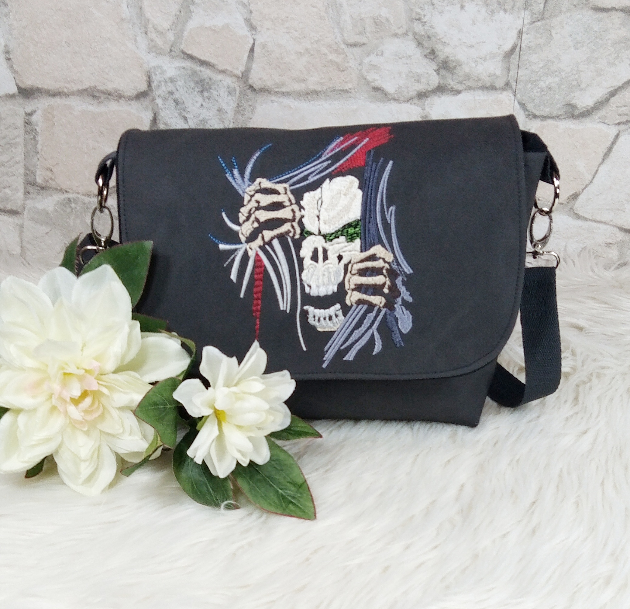 Die Tasche wurde aus Baumwolle und Kunstleder hergestellt. Verstärkt wurde sie mit einem Vlies aus Polyester, damit sie auch mit wenig Inhalt gut aussieht und Stand hat. Zusätzlich ist sie mit einer aufwendigen Stickerei auf der Taschenklappe verziert.