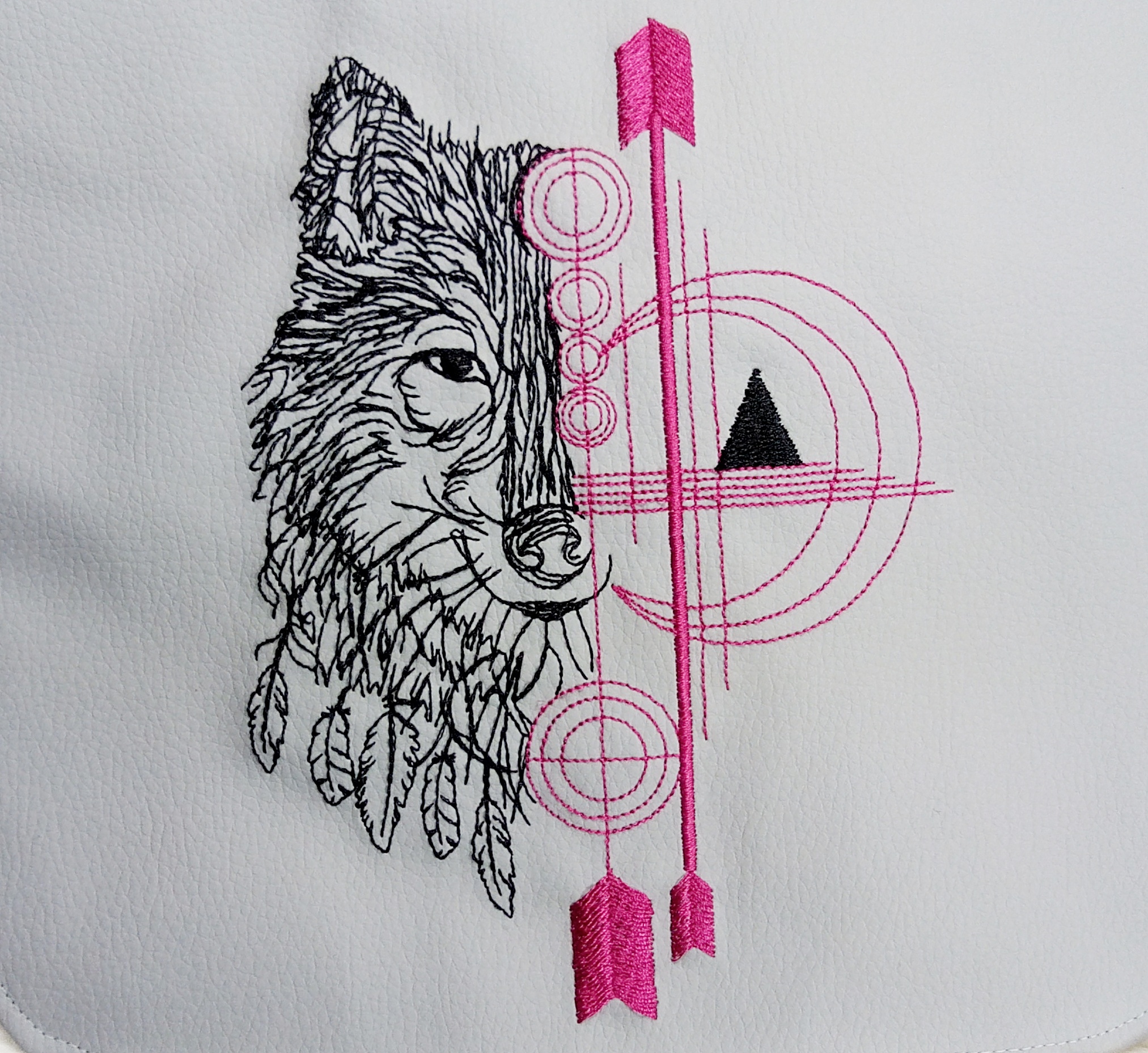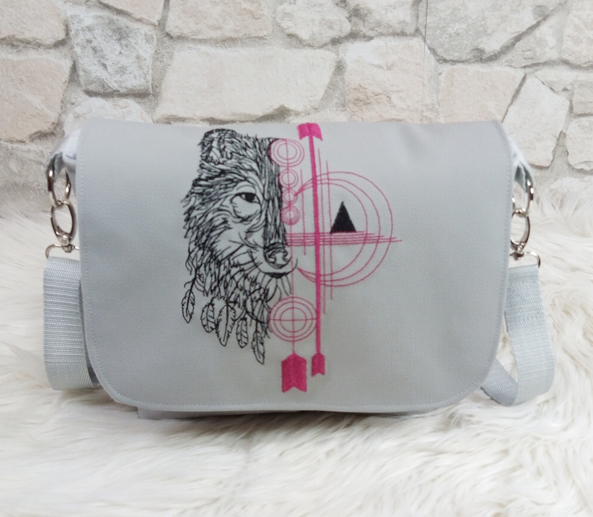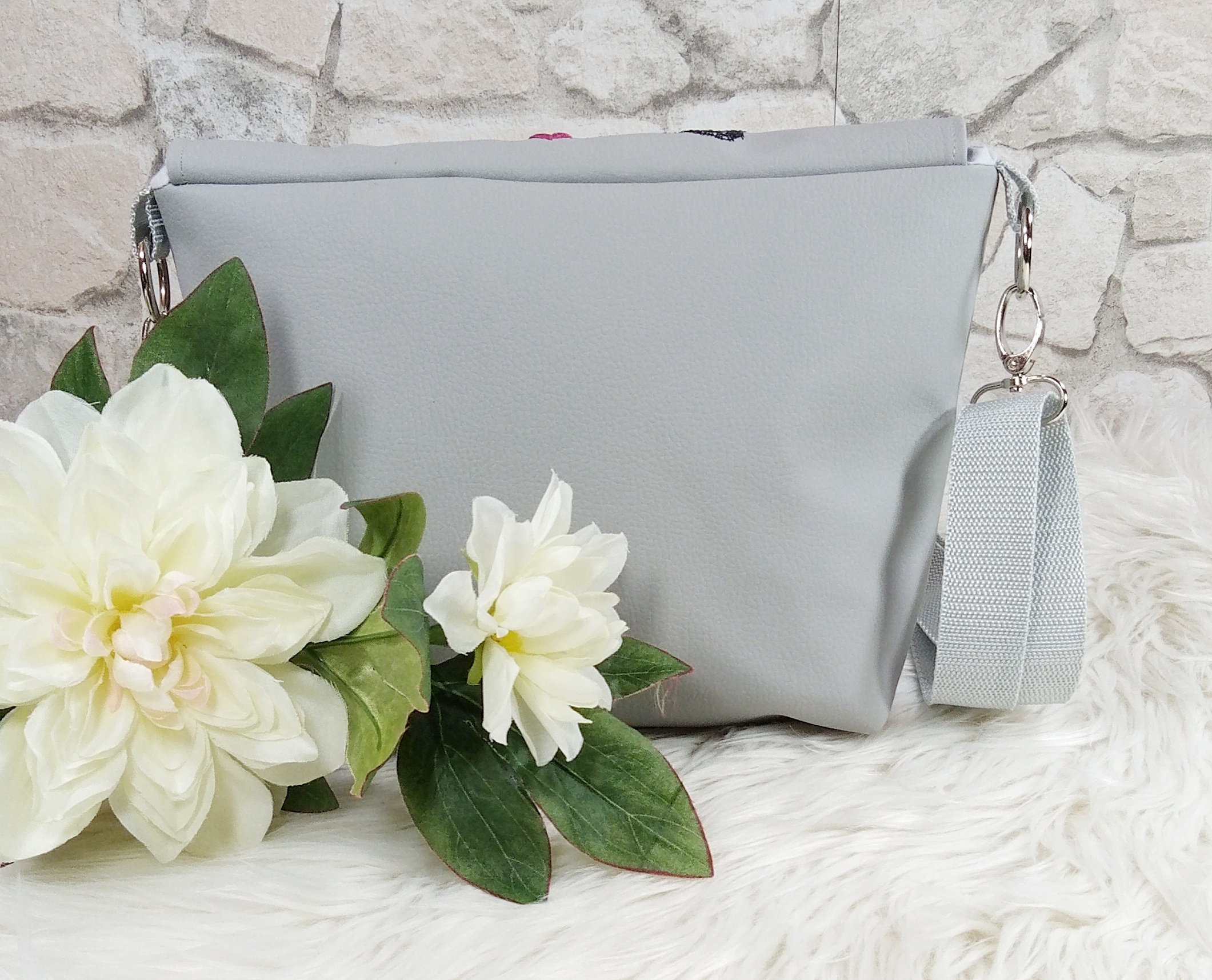 Die Tasche wurde aus Baumwolle und Kunstleder hergestellt. Verstärkt wurde sie mit einem Vlies aus Polyester, damit sie auch mit wenig Inhalt gut aussieht und Stand hat. Zusätzlich ist sie mit einer aufwendigen Stickerei auf der Taschenklappe verziert.